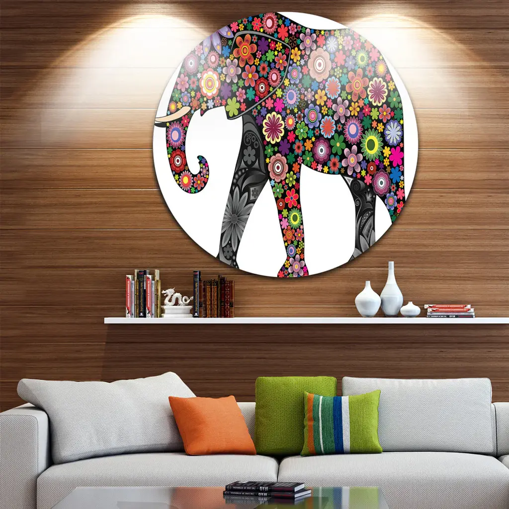 Bring Contemporary Abstraction to your home with this large Circle Metal wall art. This Cheerful Elephant Metal Artwork makes it the focal point of any room or office. - White Gloss Coating ensures colors are extra vibrant with light reflection.- Aluminum grade Sheet Metal with 1 inch mounting frame on the back giving the illusion that the artwork is floating on the wall..- Mounting Brackets are included along with instructions.- High Quality Digital images are created directly into a glossy aluminum panel producing a stunning and captivating print into the glossy finish of the metal.- Water, Fire and Scratch resistant HD Aluminum panels.- Looks better than any photo paper and guaranteed to last at least 20 years- Easy to clean with a microfiber cloth. Colors are far superior to regular Canvas Art. - Easy to Hang
