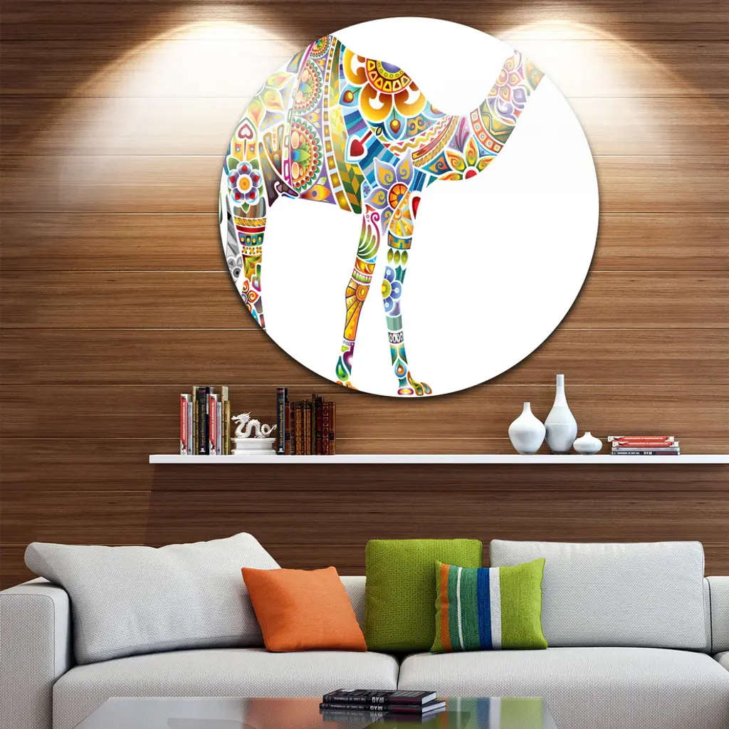 Bring Contemporary Abstraction to your home with this large Circle Metal wall art. This Cheerful Floral Camel Metal Artwork makes it the focal point of any room or office. - White Gloss Coating ensures colors are extra vibrant with light reflection.- Aluminum grade Sheet Metal with 1 inch mounting frame on the back giving the illusion that the artwork is floating on the wall..- Mounting Brackets are included along with instructions.- High Quality Digital images are created directly into a glossy aluminum panel producing a stunning and captivating print into the glossy finish of the metal.- Water, Fire and Scratch resistant HD Aluminum panels.- Looks better than any photo paper and guaranteed to last at least 20 years- Easy to clean with a microfiber cloth. Colors are far superior to regular Canvas Art. - Easy to Hang
