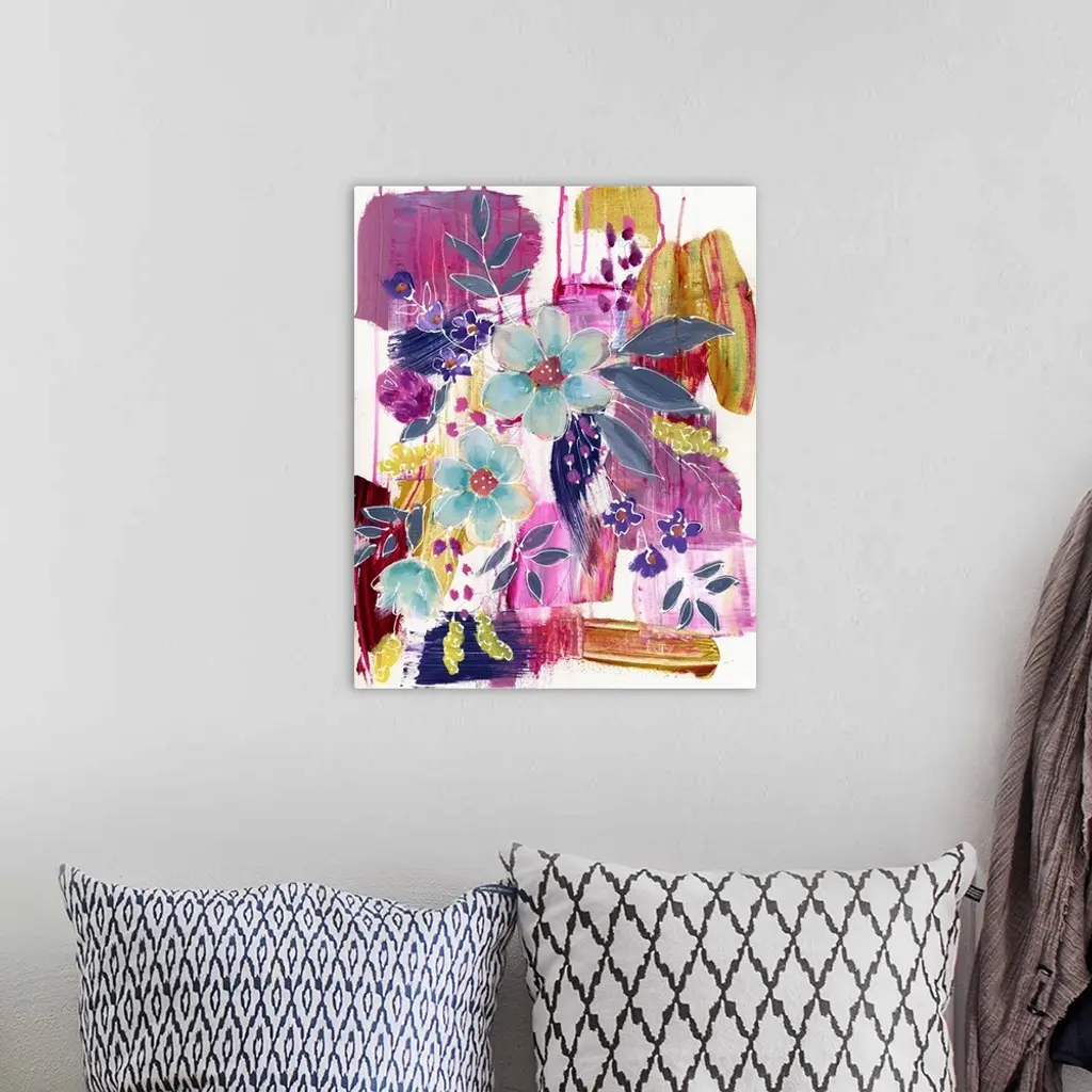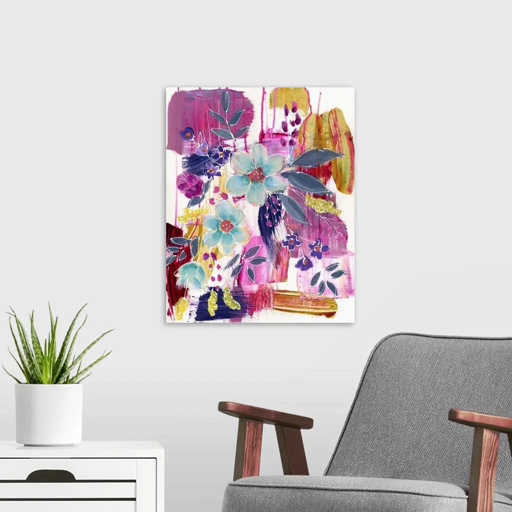 Contemporary vibrant colorful painting using purple and pink tones with flowers and abstract elements.
