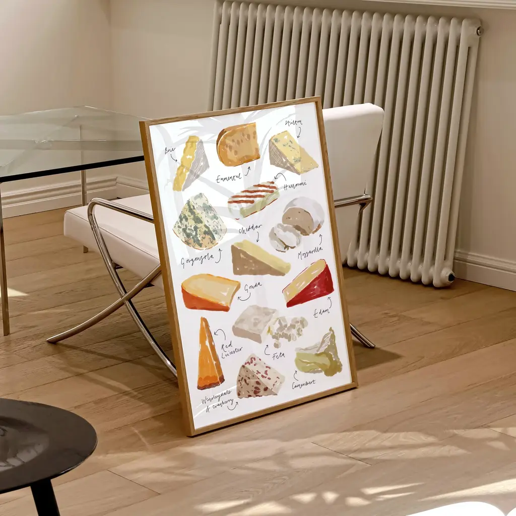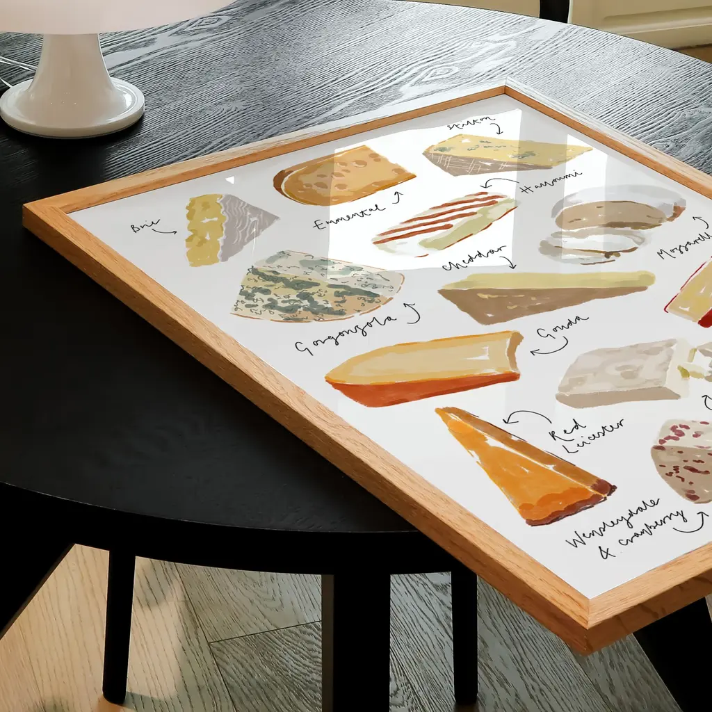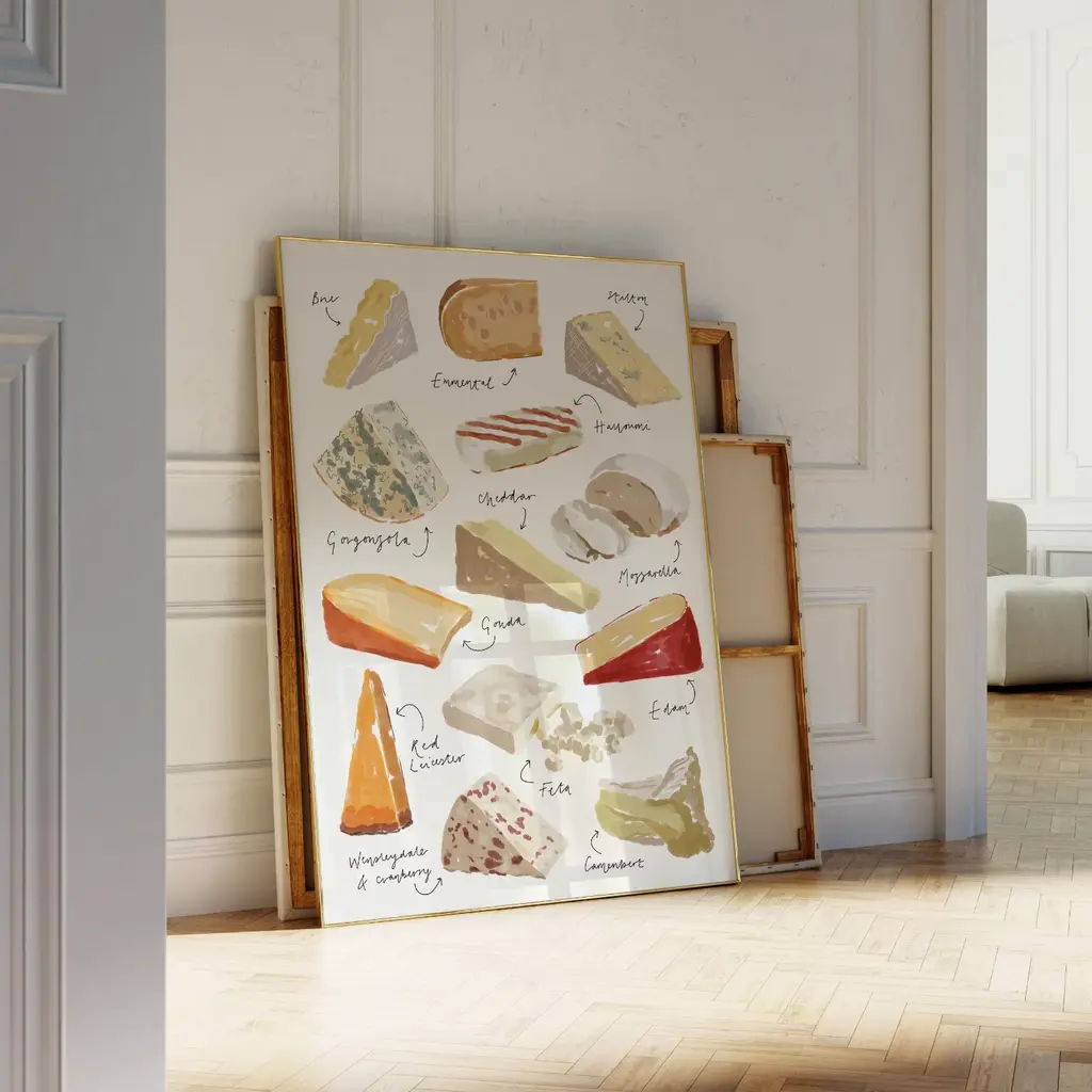 Cheese Hand Painted Art Print - A2Indulge your love for cheese with our hand painted "Cheese" print. Designed to add a touch of style to your kitchen or office, this high-quality art print features a delicate design with all your favourite types of cheese to make for a perfect gift for cheese enthusiasts. All prints are digitally designed by myself and printed to order.Smooth fine art 230 gsm matte card. Printed with vivid colour and detail. Sold without a frame.