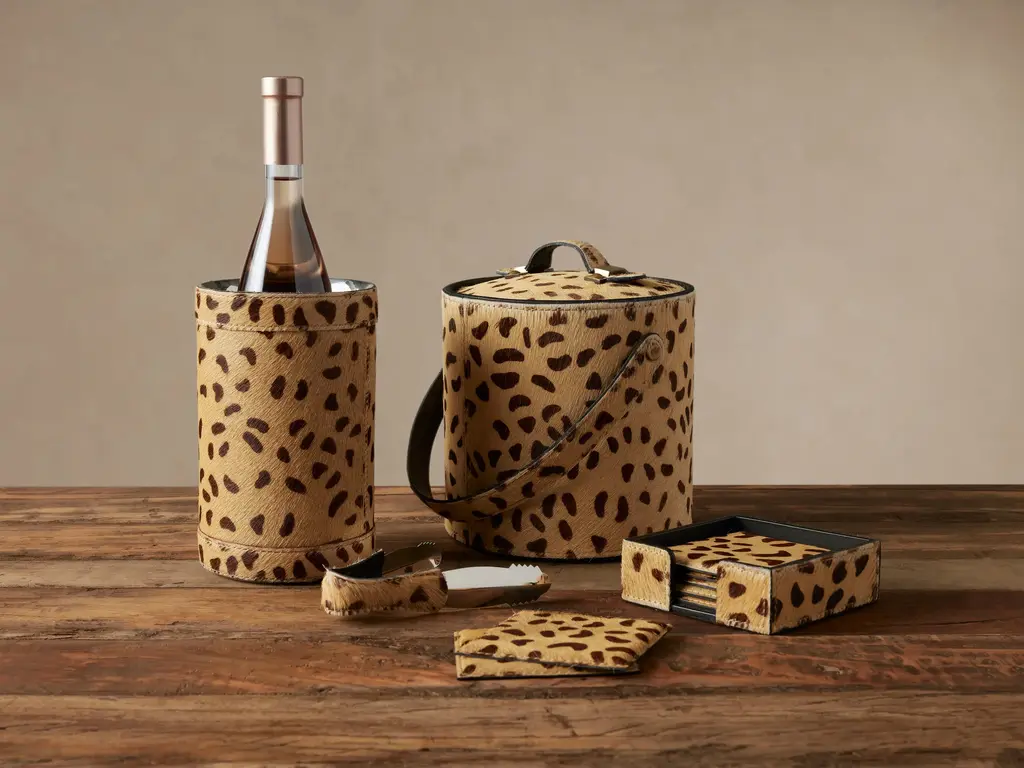 Wrapped in natural hair on hide with leather accents, our Cheetah Print Coaster Set brings style to your bar or dining areas with its spotted pattern. Handcrafted in India by master artisans with incredible attention to detail from hand-chosen hide pieces to the stitched accents. Made in India from natural hair on hide. Set of four coasters and holder. Due to its natural hide, each piece may vary in shading, hair length, and texture, making it a unique work of art. No two pieces will be exactly alike.