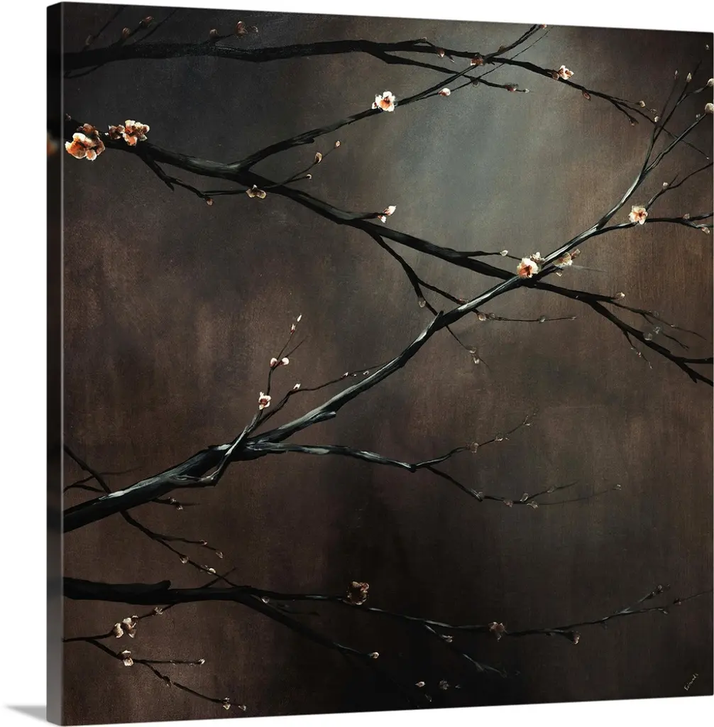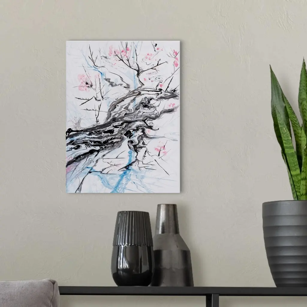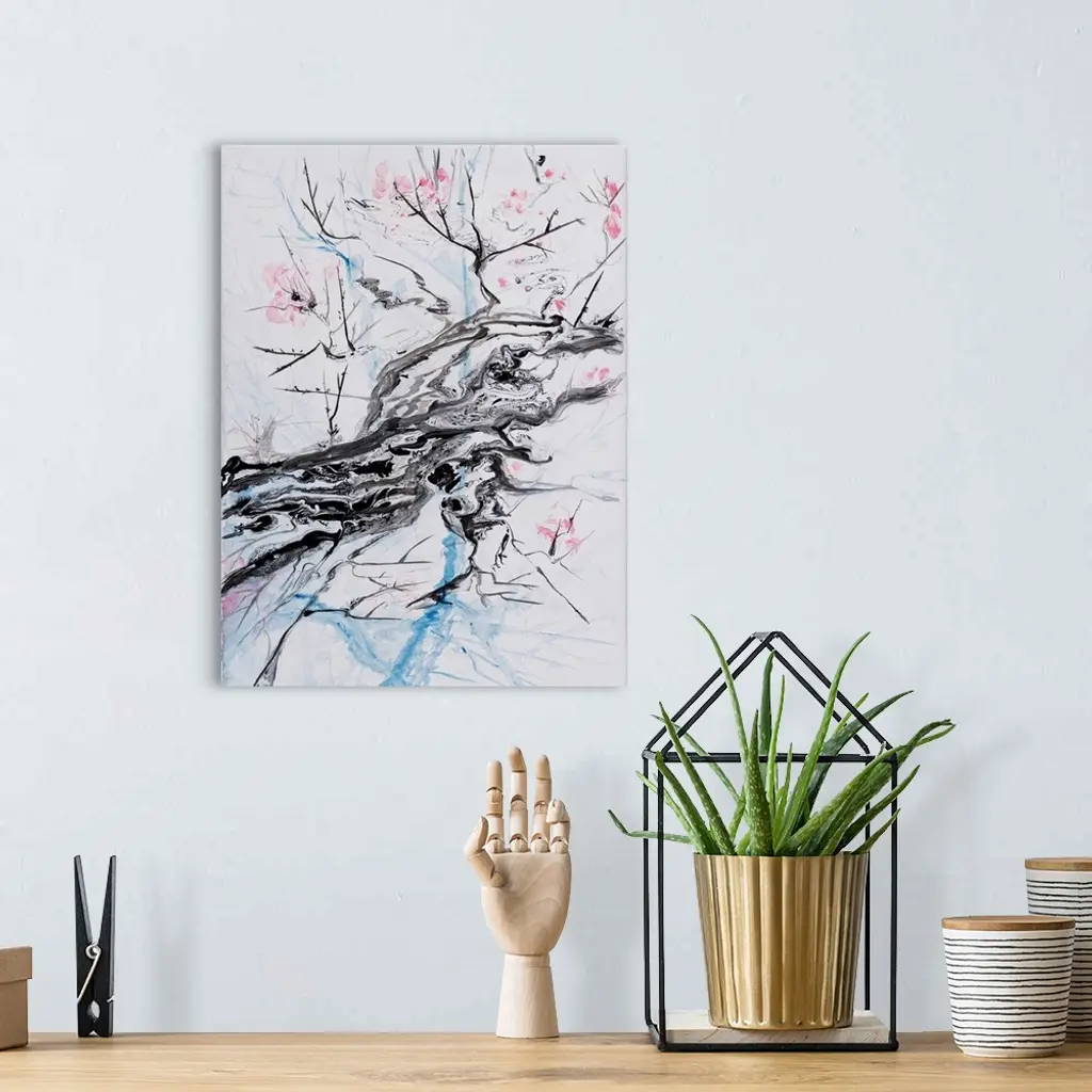 Painting of impressionistic branches with cherry bloom in a pastel color palette with translucent pours of paint and delicate brushstrokes.