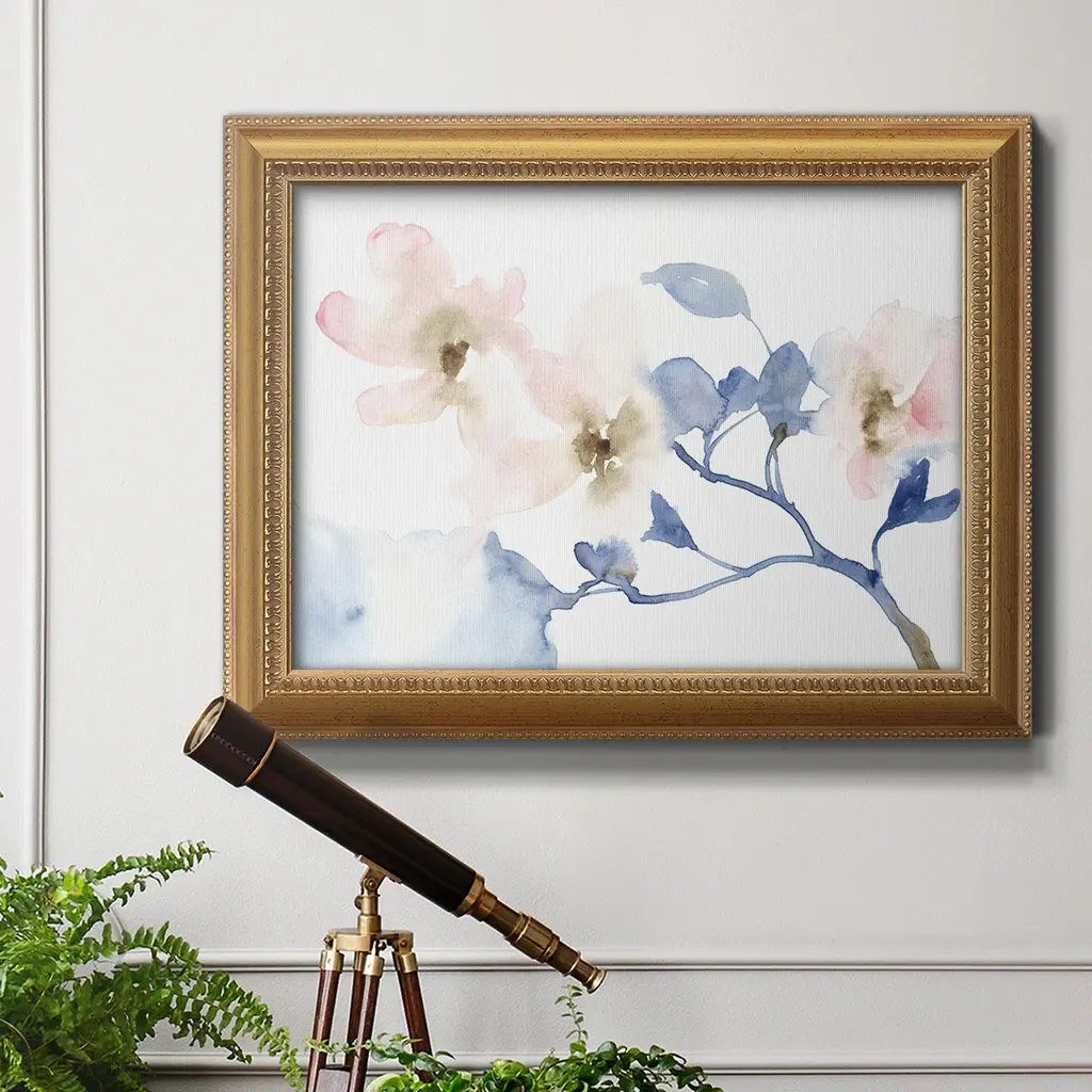 Cherry Blossom Light I Premium Framed Canvas- Ready to Hang A Premium Framed Canvas created to last. Framed in distressed wood and available in an array of sizes and colors Featuring a beveled a solid wood stretcher bar, each piece comes ready to hand 3 SIZES AVAILABLE 16''X20'' - Overall Size 18'X27'' - Overall Size 24''x36'' - Overall Size Each piece is made to order. Each piece comes with hanging hardware. Made in the USA Ready to Hang Giclee Paper Print Acrylic Glass Beveled Matt Board