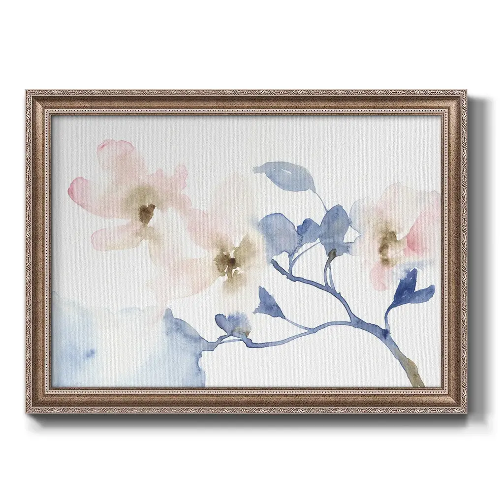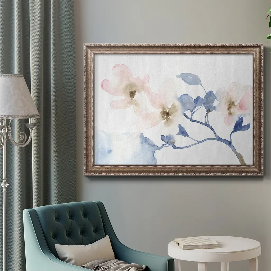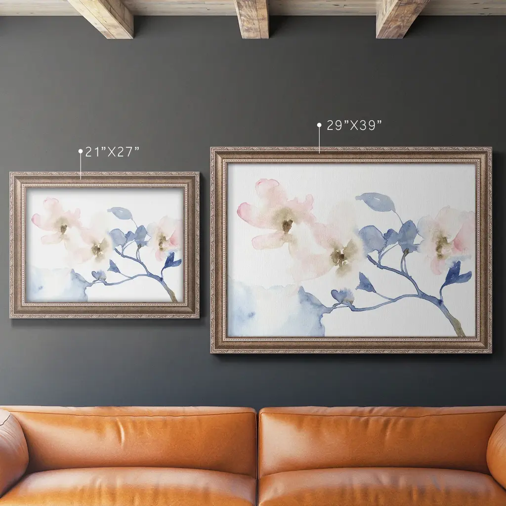 Cherry Blossom Light I Premium Framed Canvas- Ready to Hang A Premium Framed Canvas created to last. Framed in distressed wood and available in an array of sizes and colors Featuring a beveled a solid wood stretcher bar, each piece comes ready to hand 3 SIZES AVAILABLE 16''X20'' - Overall Size 18'X27'' - Overall Size 24''x36'' - Overall Size Each piece is made to order. Each piece comes with hanging hardware. Made in the USA Ready to Hang Giclee Paper Print Acrylic Glass Beveled Matt Board