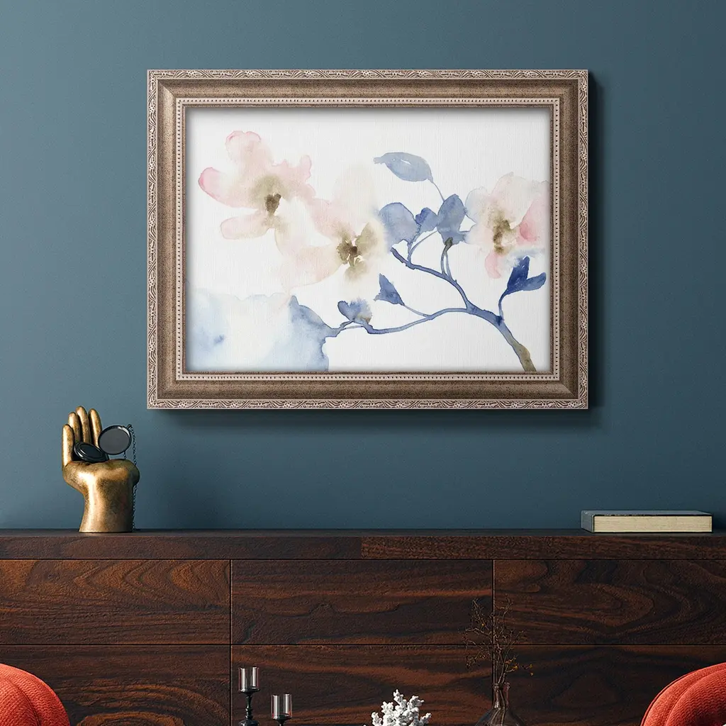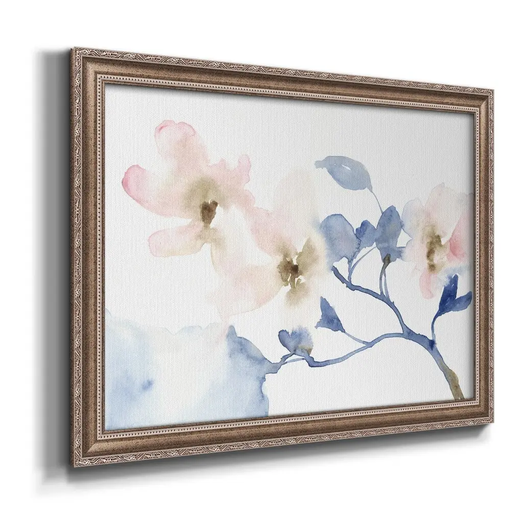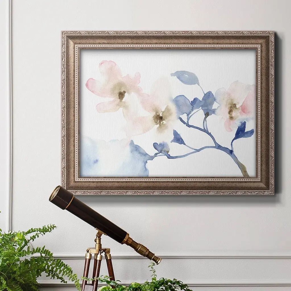 Cherry Blossom Light I Premium Framed Canvas- Ready to Hang A Premium Framed Canvas created to last. Framed in distressed wood and available in an array of sizes and colors Featuring a beveled a solid wood stretcher bar, each piece comes ready to hand 3 SIZES AVAILABLE 16''X20'' - Overall Size 18'X27'' - Overall Size 24''x36'' - Overall Size Each piece is made to order. Each piece comes with hanging hardware. Made in the USA Ready to Hang Giclee Paper Print Acrylic Glass Beveled Matt Board