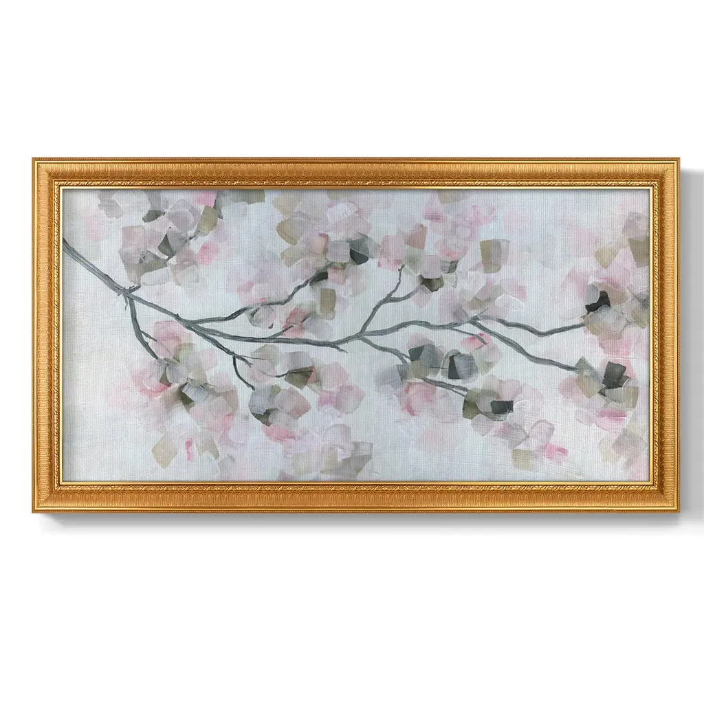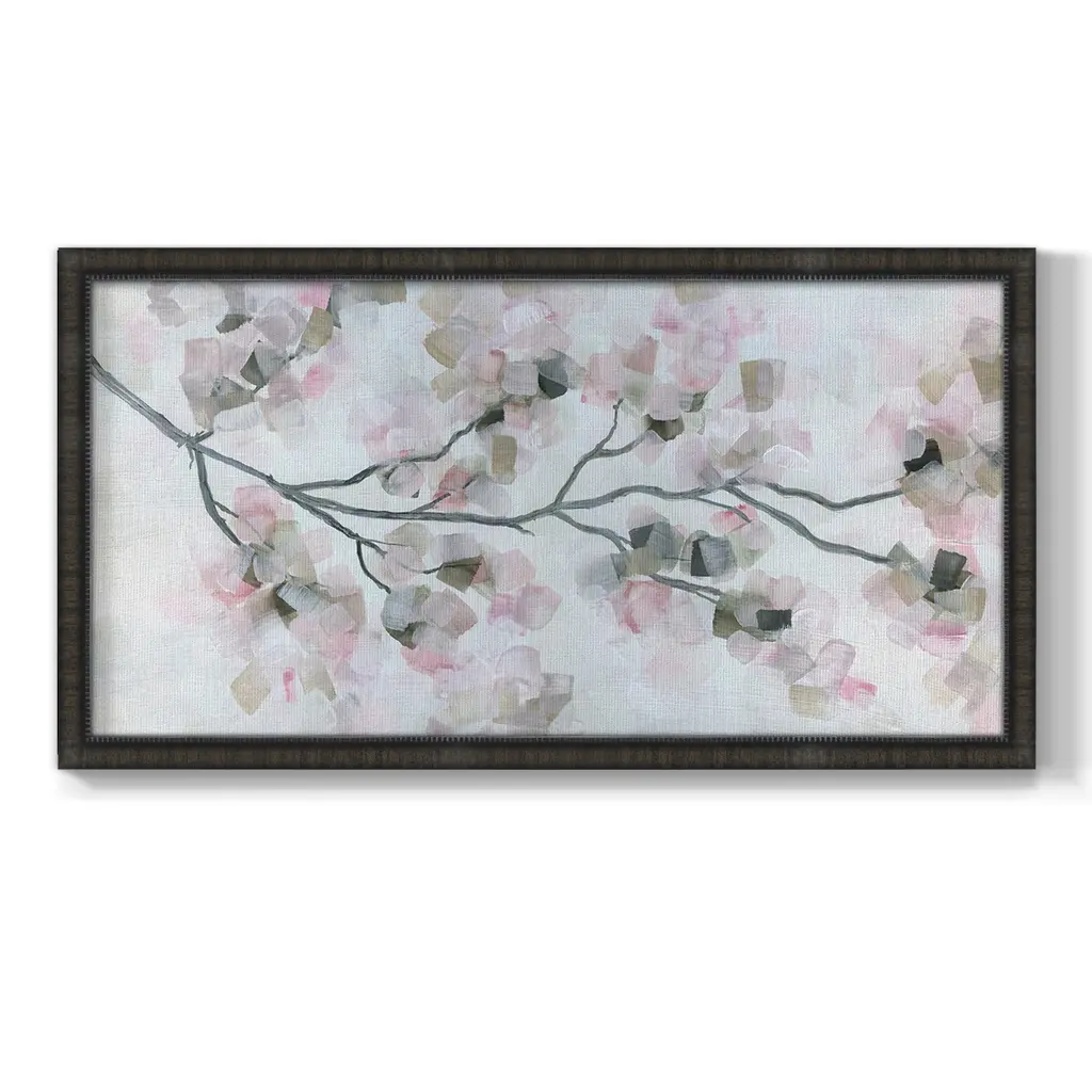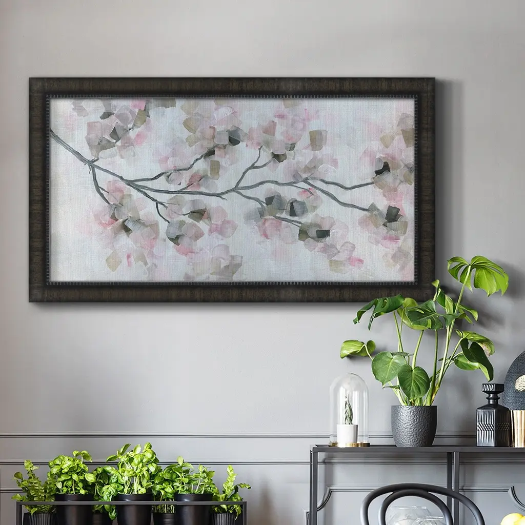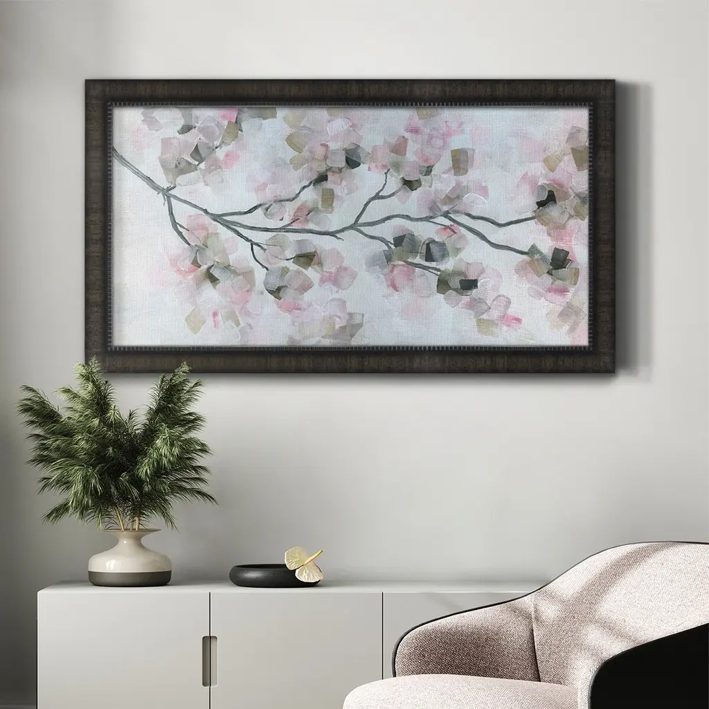 Cherry Blossoms Premium Framed Canvas- Ready to Hang A Premium Framed Canvas created to last. Framed in distressed wood and available in an array of sizes and colors Featuring a beveled a solid wood stretcher bar, each piece comes ready to hand 3 SIZES AVAILABLE 21''X37'' - Overall Size 25''X45'' - Overall Size 29''x53'' - Overall Size Each piece is made to order. Each piece comes with hanging hardware. Made in the USA Ready to Hang Giclee Paper Print Acrylic Glass Beveled Matt Board