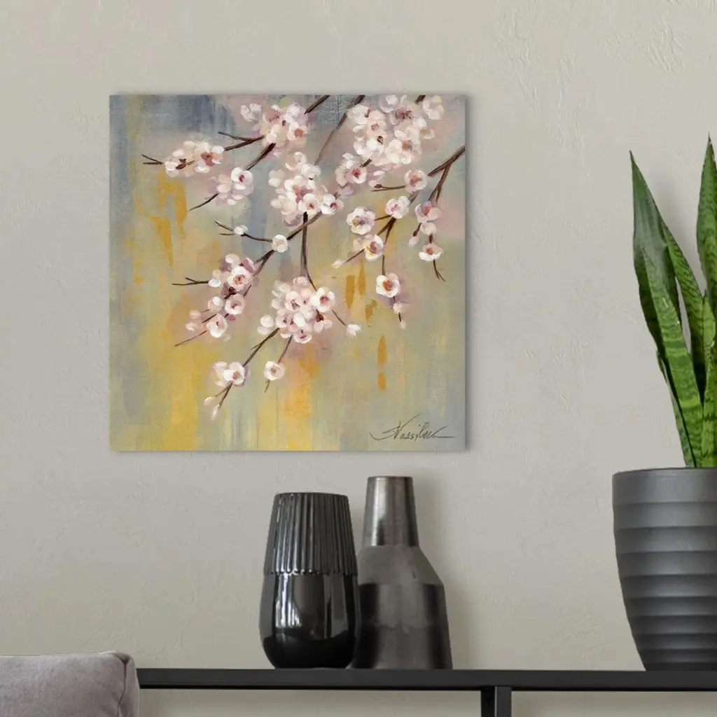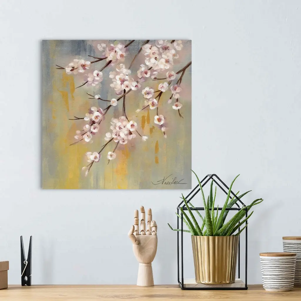 Contemporary painting of branches with pink cherry blossoms.