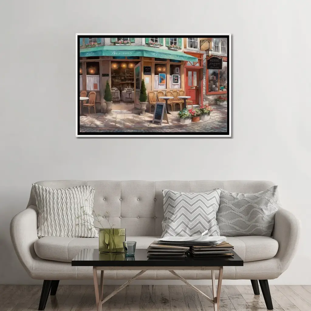 Contemporary painting of a restaurant storefront downtown in a city.