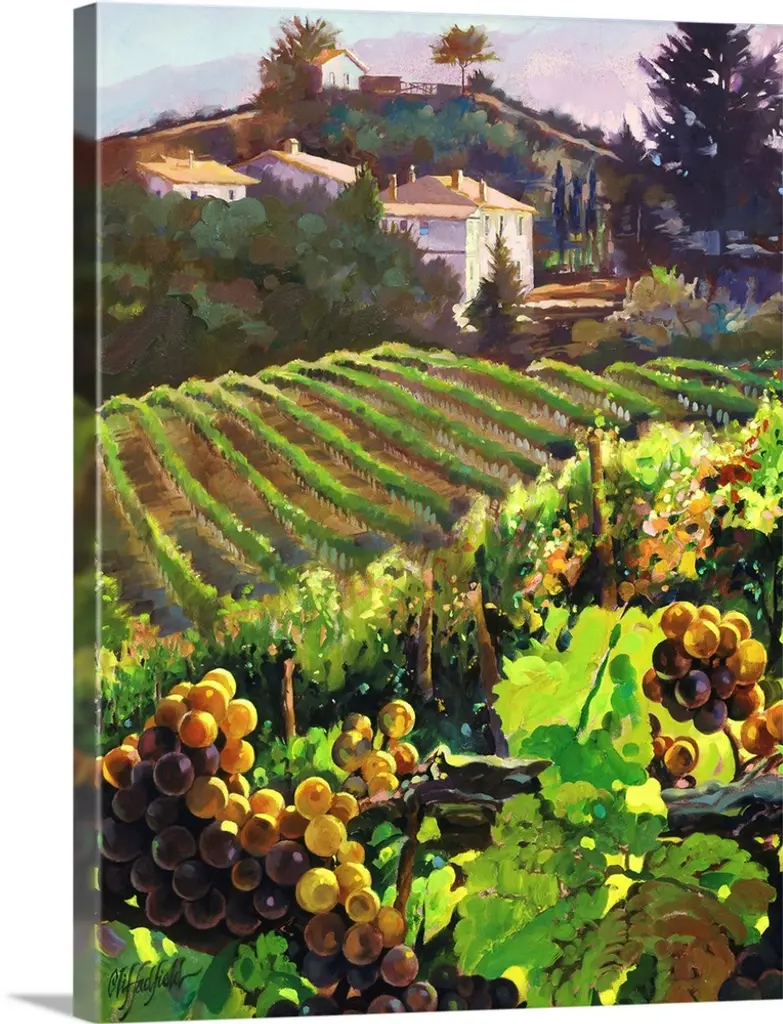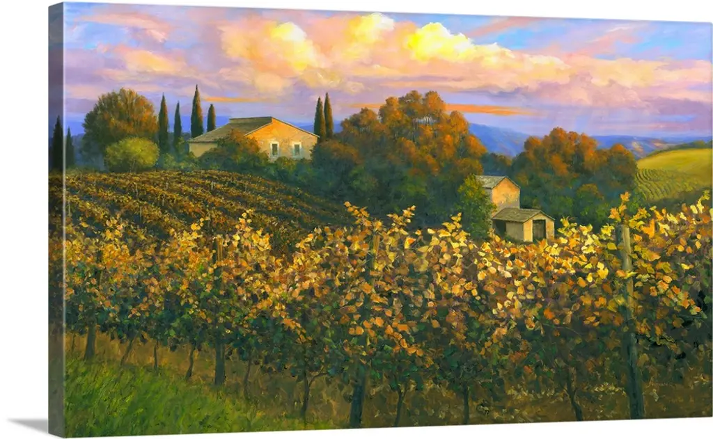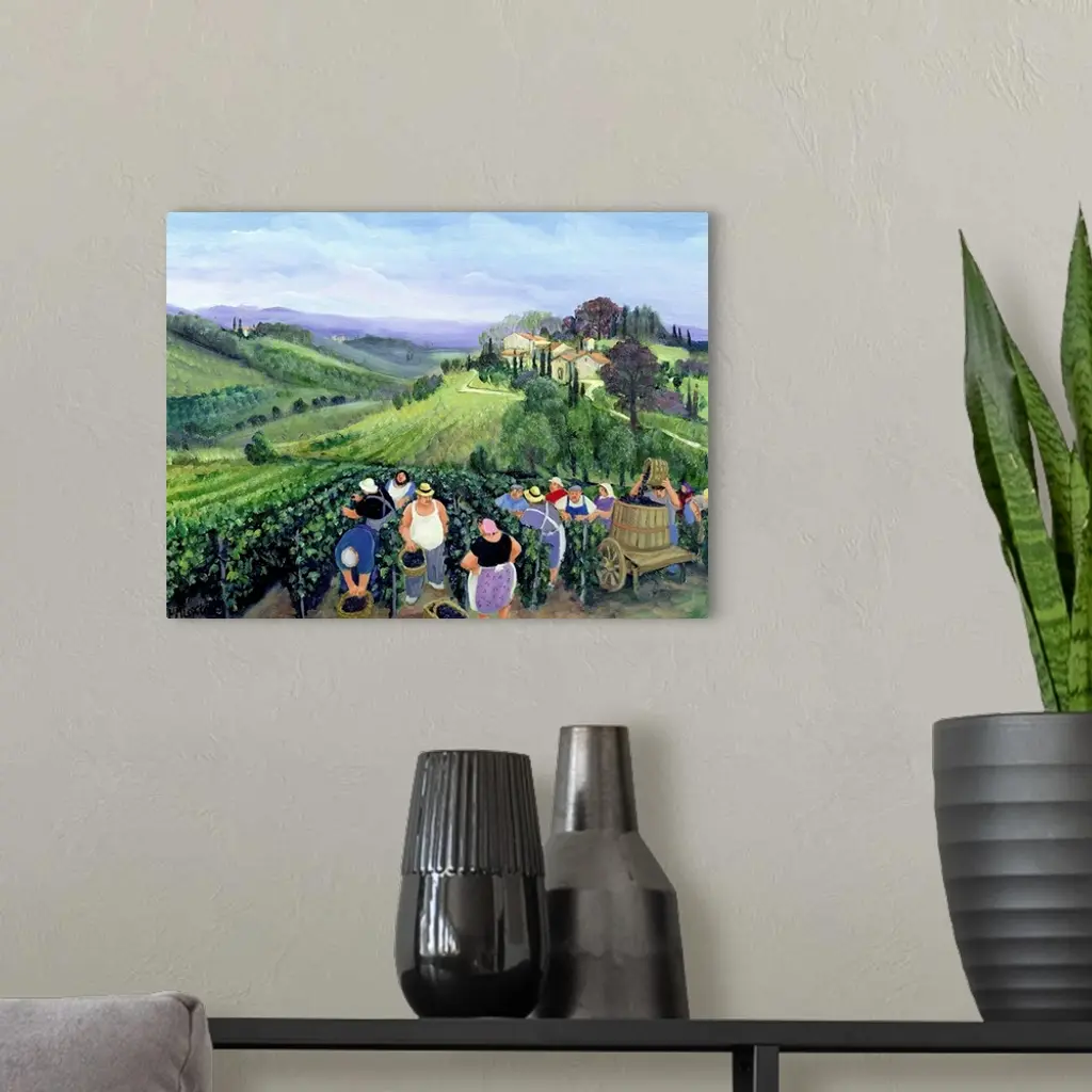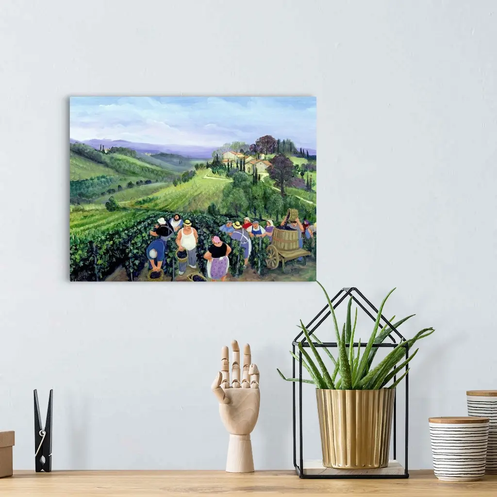 Contemporary painting of farmers in a vineyard in Tuscany.