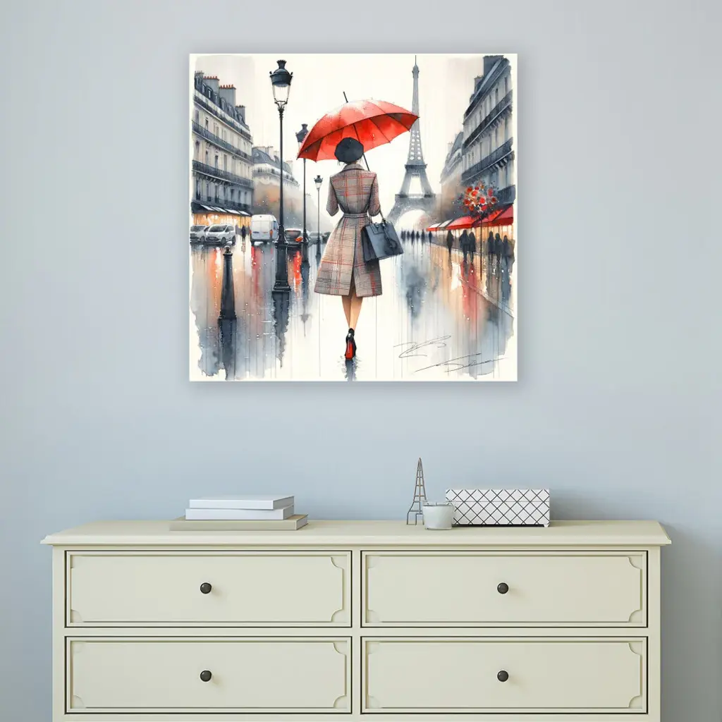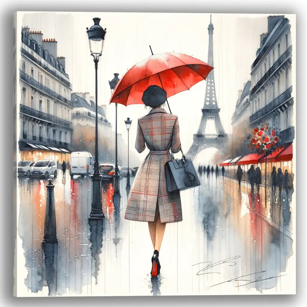 Discover the allure of Paris on a rain-kissed day with "Chic Parisian Rain - Eiffel Tower Watercolor," a canvas that brings the romance of the City of Lights into your home. This piece features a stylish figure, umbrella in hand, with the majestic Eiffel Tower in the backdrop, enveloped by the poetic ambiance of a drizzly Parisian street.Features and Benefits:# Captivating Scene: The artwork''s watercolor aesthetic renders the Paris streets in a dream-like haze, with vibrant accents that catch the eye.# Durable Canvas: Crafted on a premium canvas stretched over a solid frame, ensuring longevity and durability.# Easy Installation: Comes ready to hang with pre-attached hardware, for a seamless setup.# Made in the USA, combining local craftsmanship with artistic expression.