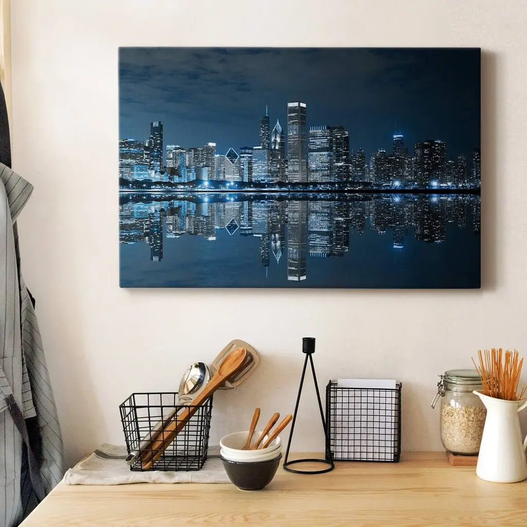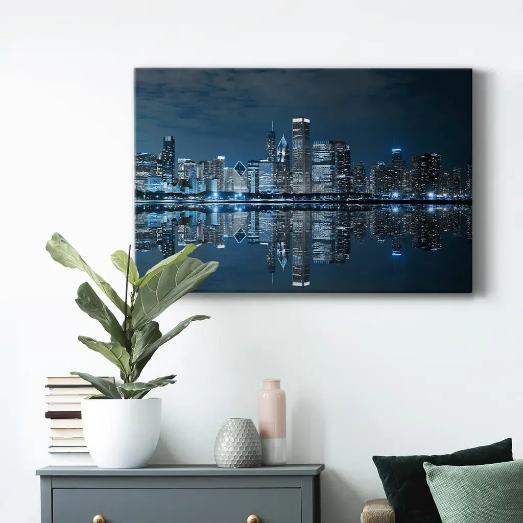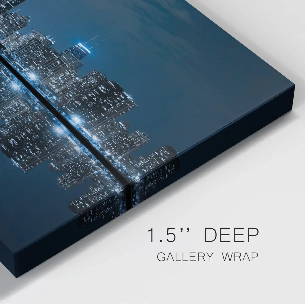Chicago At Night Premium Gallery Wrapped Canvas - Ready to Hang A premium hand stretched gallery wrapped canvas print created to last. Featuring a beveled a solid wood stretcher bar, each piece comes ready to hand 6 SIZES AVAILABLE 8''X12'' - Overall Size 12''X18'' - Overall Size 18''X27'' - Overall Size 24''x36'' - Overall Size 32''x48'' - Overall Size 40''x60'' - Overall Size Each piece is made to order. Built to Last Each piece comes ready to hang Solid wood stretcher Fade and Water resistant Made domestically
