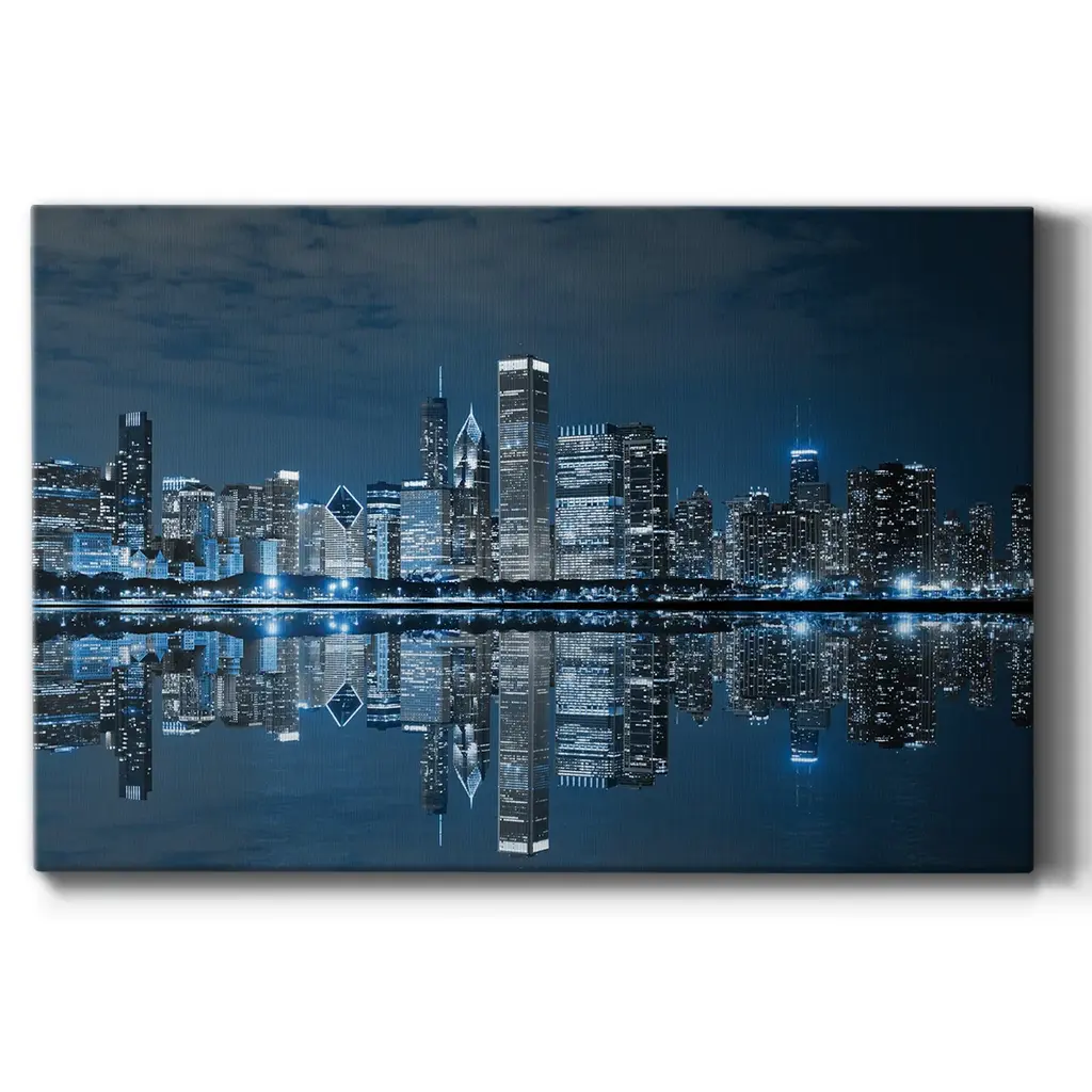 Chicago At Night Premium Gallery Wrapped Canvas - Ready to Hang A premium hand stretched gallery wrapped canvas print created to last. Featuring a beveled a solid wood stretcher bar, each piece comes ready to hand 6 SIZES AVAILABLE 8''X12'' - Overall Size 12''X18'' - Overall Size 18''X27'' - Overall Size 24''x36'' - Overall Size 32''x48'' - Overall Size 40''x60'' - Overall Size Each piece is made to order. Built to Last Each piece comes ready to hang Solid wood stretcher Fade and Water resistant Made domestically