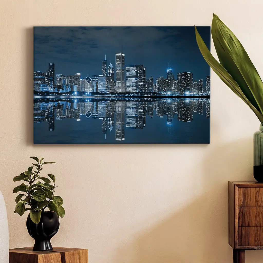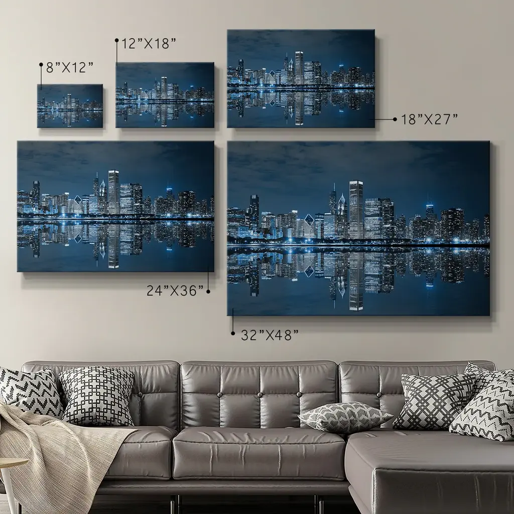 Chicago At Night Premium Gallery Wrapped Canvas - Ready to Hang A premium hand stretched gallery wrapped canvas print created to last. Featuring a beveled a solid wood stretcher bar, each piece comes ready to hand 6 SIZES AVAILABLE 8''X12'' - Overall Size 12''X18'' - Overall Size 18''X27'' - Overall Size 24''x36'' - Overall Size 32''x48'' - Overall Size 40''x60'' - Overall Size Each piece is made to order. Built to Last Each piece comes ready to hang Solid wood stretcher Fade and Water resistant Made domestically