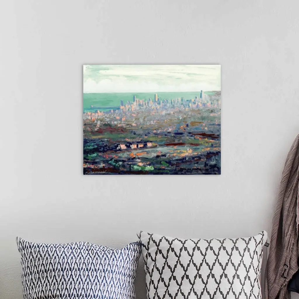 Chicago Blue Dusk By RD Riccoboni, Abstract Painting 2007. Inspired by the view as the sun set to the west and the light reflected off the skyline to the east of the urban metropolis from a flight into the windy city while traveling across country.