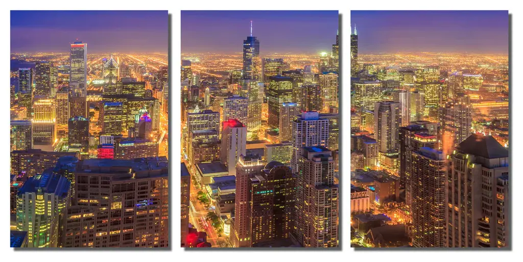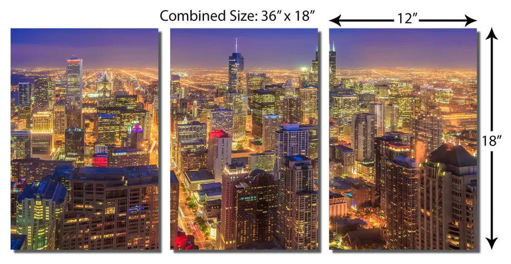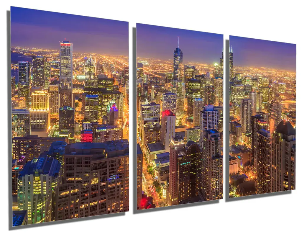 36"œ x 18"œ total size. Ready To Hang! (3 pieces - 12"œ x 18"œ each). 3 Panel Split (Triptych) Chicago city evening skyline aerial photography Metal Print. Modern metal wall art for home or office wall decor & interior design. Printed on Luxurious, HD aluminum glossy metal panels. Multi panel art.. HD aluminum panels. Metal print wall art. Includes Shadow Wall Mount on the back.• Aluminum Metal Wall Art• Made in USA• Ready to hang - No assembly required• Shadow mount hardware on the back• 0.045"œ thick HD Aluminum Panels• Scratch resistant, glossy finish• Superb color clarity, luxurious prints• Epson printing process• For indoor or moisture rich environment use• Easy to clean. Gently wipe with microfiber cloth.