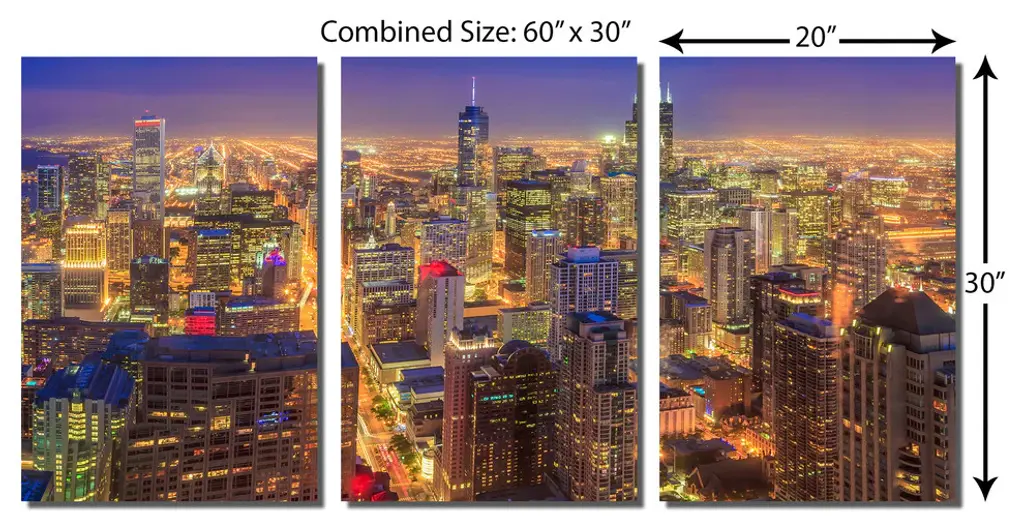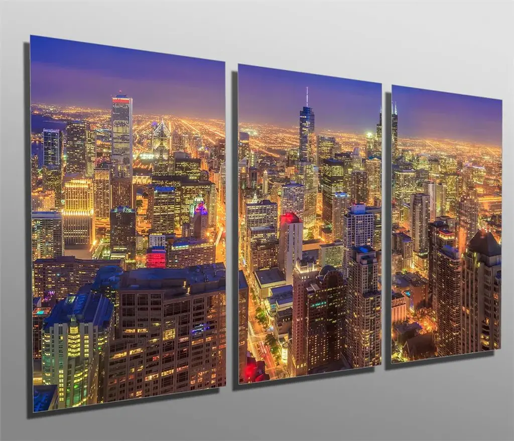 60"œ x 30"œ total size. Ready To Hang! (3 pieces - 20"œ x 30"œ each). 3 Panel Split (Triptych) Chicago city evening skyline aerial photography Metal Print. Modern metal wall art for home or office wall decor & interior design. Printed on Luxurious, HD aluminum glossy metal panels. Multi panel art.. HD aluminum panels. Metal print wall art. Includes Shadow Wall Mount on the back.• Aluminum Metal Wall Art• Made in USA• Ready to hang - No assembly required• Shadow mount hardware on the back• 0.045"œ thick HD Aluminum Panels• Scratch resistant, glossy finish• Superb color clarity, luxurious prints• Epson printing process• For indoor or moisture rich environment use• Easy to clean. Gently wipe with microfiber cloth.