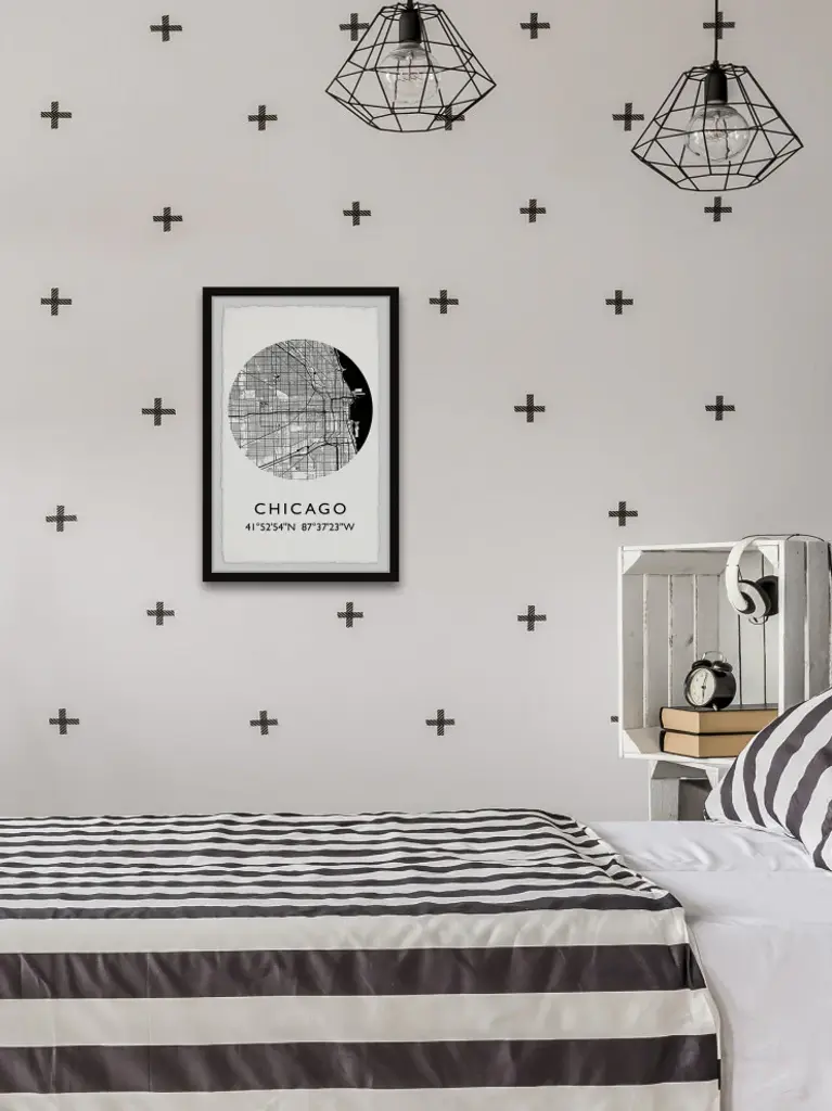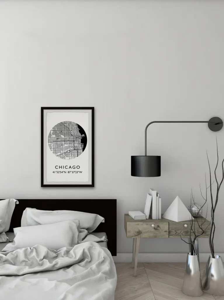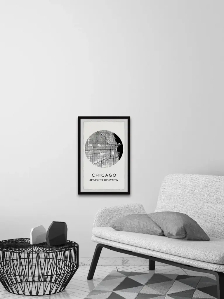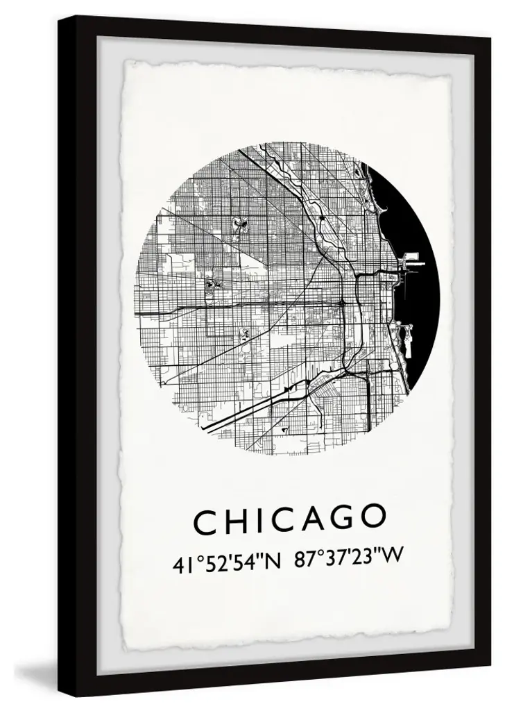 Show others that your heart is in Chicago with this black and white textual print that features the city''s name, coordinates, and a detailed map. Proudly printed in the USA, this piece is printed on high quality archive paper and professionally hand-framed. With wall-mounting hooks included, this artful accent is ready to hang up as soon as it reaches your front door.- Top quality Gicle print on high resolution Archive Paper- Hand cut deckled edges- High quality durable non-warping frame- Finished under shatter resistant plexiglass- Arrives ready to hang- Includes a certificate of authenticity- Printed in the USA