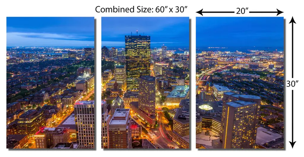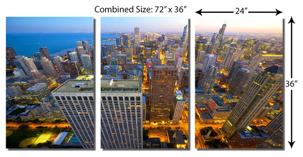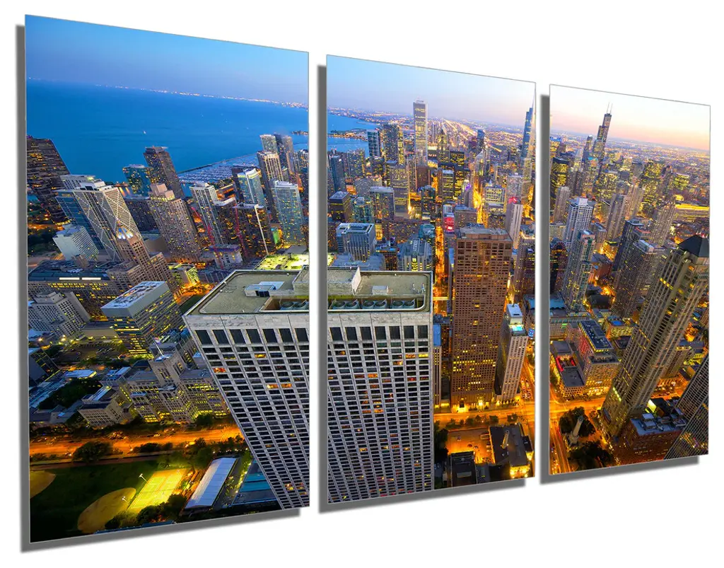 72"œ x 36"œ total size. Ready To Hang! (3 pieces - 24"œ x 36"œ each). 3 Panel Split (Triptych) Metal Print of Chicago Skyline aerial view at dusk. Modern metal wall art for home or office wall decor & interior design. Printed on Luxurious, HD aluminum glossy metal panels. Multi panel art.. HD aluminum panels. Metal print wall art. Includes Shadow Wall Mount on the back.• Aluminum Metal Wall Art• Made in USA• Ready to hang - No assembly required• Shadow mount hardware on the back• 0.045"œ thick HD Aluminum Panels• Scratch resistant, glossy finish• Superb color clarity, luxurious prints• Epson printing process• For indoor or moisture rich environment use• Easy to clean. Gently wipe with microfiber cloth.