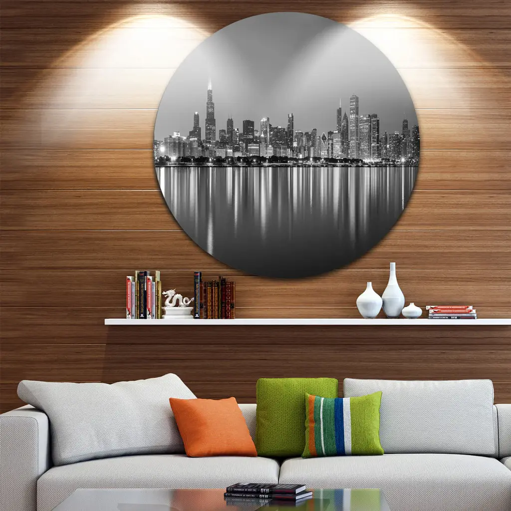 Bring Contemporary Abstraction to your home with this large Circle Metal wall art. This Chicago Skyline at Night Black and White Metal Artwork makes it the focal point of any room or office. - White Gloss Coating ensures colors are extra vibrant with light reflection.- Aluminum grade Sheet Metal with 1 inch mounting frame on the back giving the illusion that the artwork is floating on the wall..- Mounting Brackets are included along with instructions.- High Quality Digital images are created directly into a glossy aluminum panel producing a stunning and captivating print into the glossy finish of the metal.- Water, Fire and Scratch resistant HD Aluminum panels.- Looks better than any photo paper and guaranteed to last at least 20 years- Easy to clean with a microfiber cloth. Colors are far superior to regular Canvas Art. - Easy to Hang