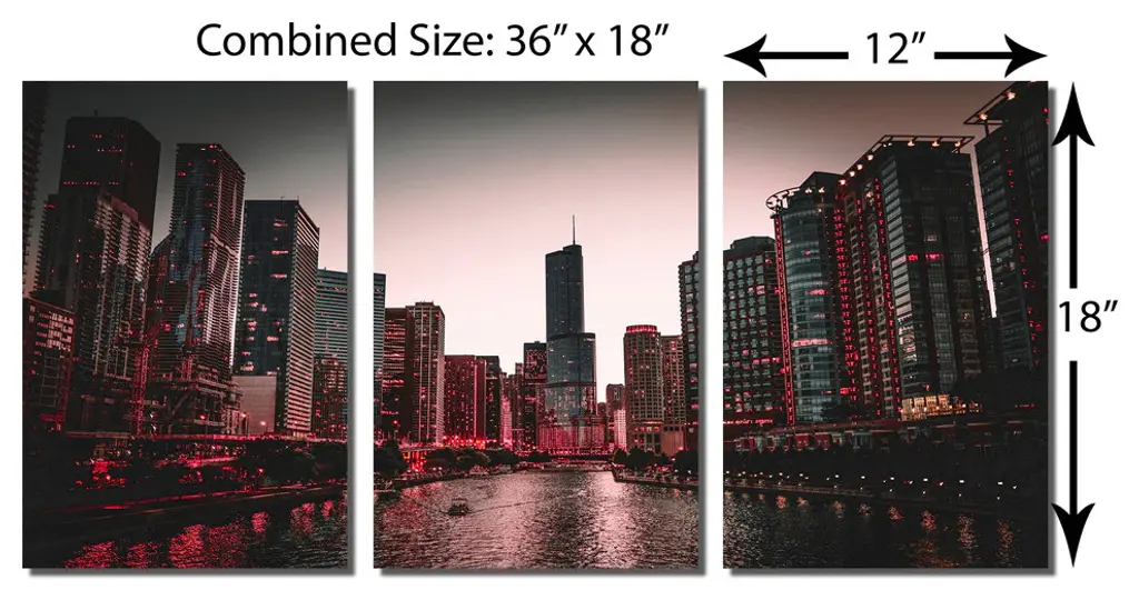 36" x 18" total size. Ready To Hang! (3 pieces - 12" x 18" each). 3 Panel Split (Triptych) Metal Print of Chicago, Illinois river skyline in cardinal color, vivid red. Modern metal wall art for home or office wall decor & interior design. Printed on Luxurious, HD aluminum glossy metal panels. Multi panel art.. HD aluminum panels. Metal print wall art. Includes Shadow Wall Mount on the back.• Aluminum Metal Wall Art• Made in USA• Ready to hang - No assembly required• Shadow mount hardware on the back• 0.045" thick HD Aluminum Panels• Scratch resistant, glossy finish• Superb color clarity, luxurious prints• Epson printing process• For indoor or moisture rich environment use• Easy to clean. Gently wipe with microfiber cloth.