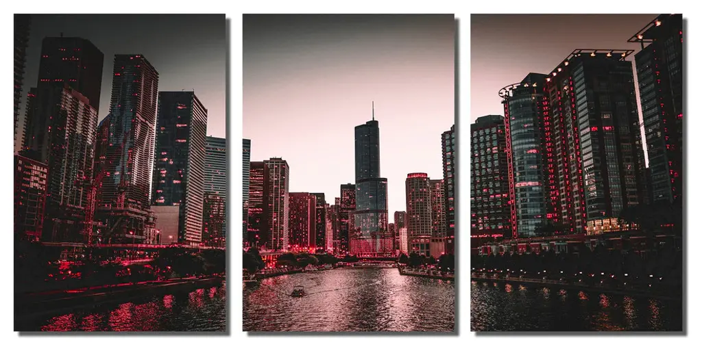 60" x 30" total size. Ready To Hang! (3 pieces - 20" x 30" each). 3 Panel Split (Triptych) Metal Print of Chicago, Illinois river skyline in cardinal color, vivid red. Modern metal wall art for home or office wall decor & interior design. Printed on Luxurious, HD aluminum glossy metal panels. Multi panel art.. HD aluminum panels. Metal print wall art. Includes Shadow Wall Mount on the back.• Aluminum Metal Wall Art• Made in USA• Ready to hang - No assembly required• Shadow mount hardware on the back• 0.045" thick HD Aluminum Panels• Scratch resistant, glossy finish• Superb color clarity, luxurious prints• Epson printing process• For indoor or moisture rich environment use• Easy to clean. Gently wipe with microfiber cloth.