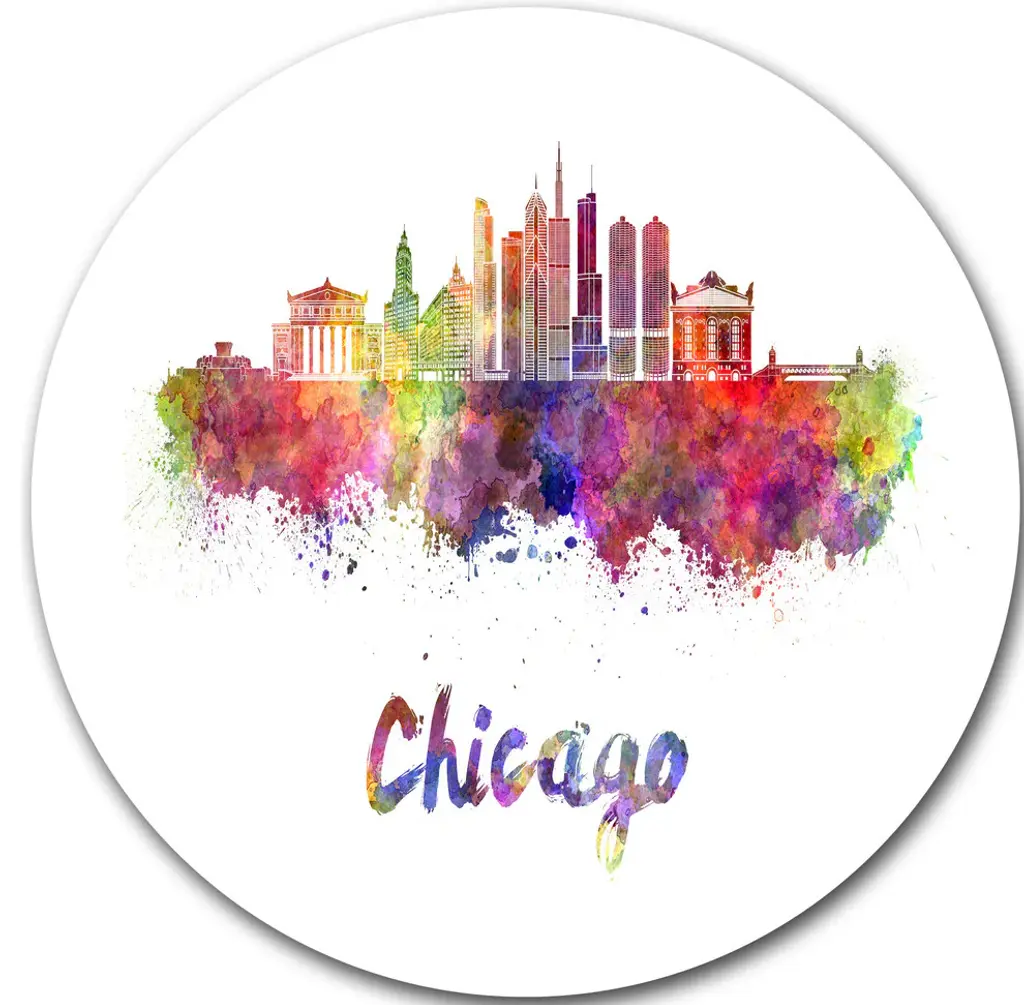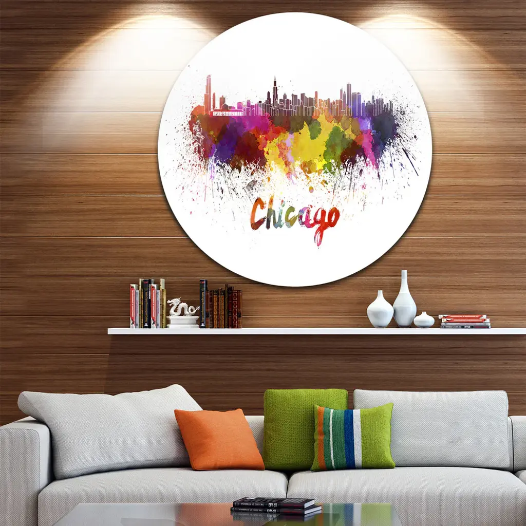 Bring Contemporary Abstraction to your home with this large Circle Metal wall art. This Chicago Skyline Metal Artwork makes it the focal point of any room or office. - White Gloss Coating ensures colors are extra vibrant with light reflection.- Aluminum grade Sheet Metal with 1 inch mounting frame on the back giving the illusion that the artwork is floating on the wall..- Mounting Brackets are included along with instructions.- High Quality Digital images are created directly into a glossy aluminum panel producing a stunning and captivating print into the glossy finish of the metal.- Water, Fire and Scratch resistant HD Aluminum panels.- Looks better than any photo paper and guaranteed to last at least 20 years- Easy to clean with a microfiber cloth. Colors are far superior to regular Canvas Art. - Easy to Hang