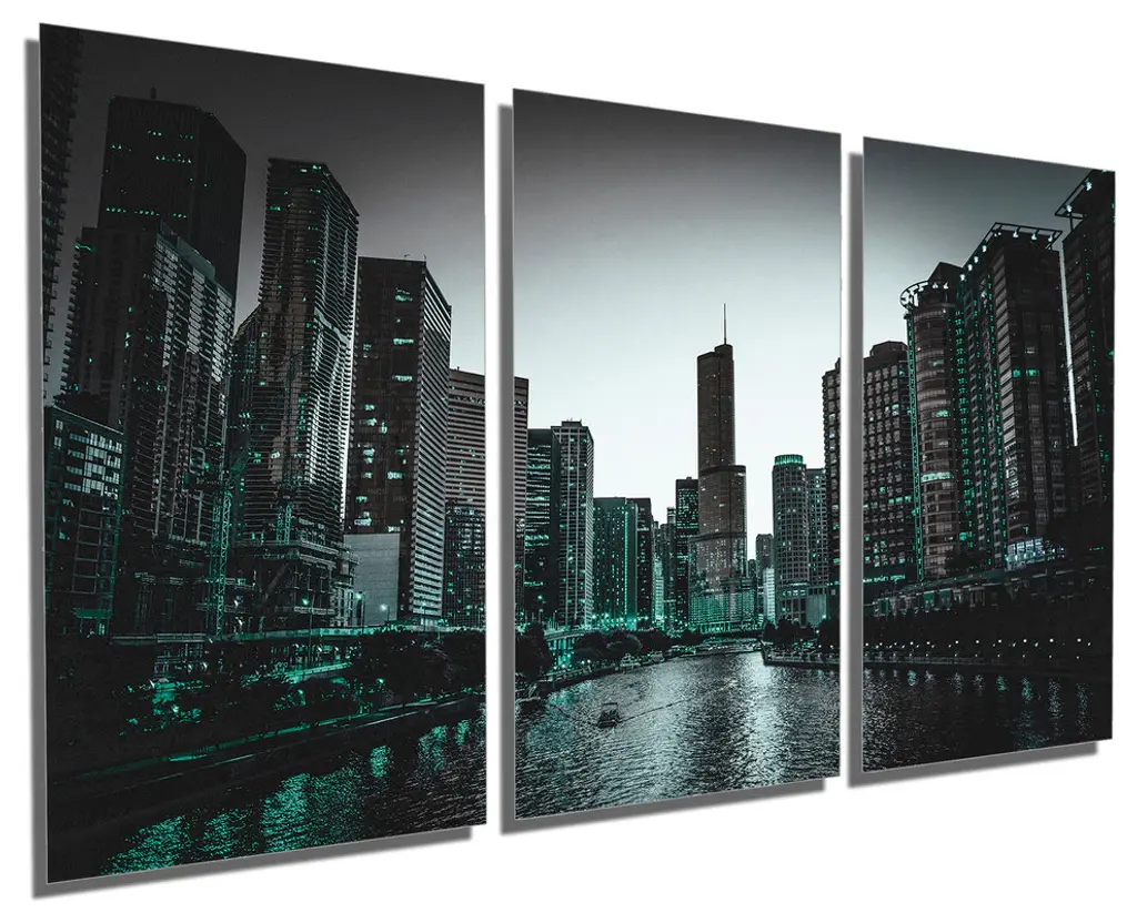 36" x 18" total size. Ready To Hang! (3 pieces - 12" x 18" each). 3 Panel Split (Triptych) Metal Print of Chicago, Illinois river skyline in Genoa color, blue green. Modern metal wall art for home or office wall decor & interior design. Printed on Luxurious, HD aluminum glossy metal panels. Multi panel art.. HD aluminum panels. Metal print wall art. Includes Shadow Wall Mount on the back.• Aluminum Metal Wall Art• Made in USA• Ready to hang - No assembly required• Shadow mount hardware on the back• 0.045" thick HD Aluminum Panels• Scratch resistant, glossy finish• Superb color clarity, luxurious prints• Epson printing process• For indoor or moisture rich environment use• Easy to clean. Gently wipe with microfiber cloth.