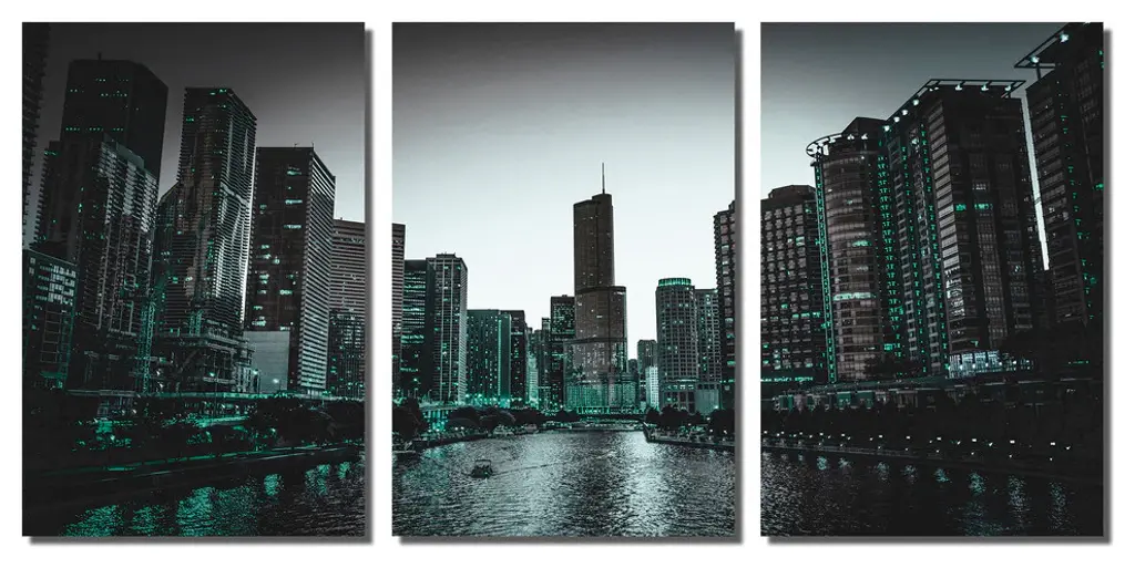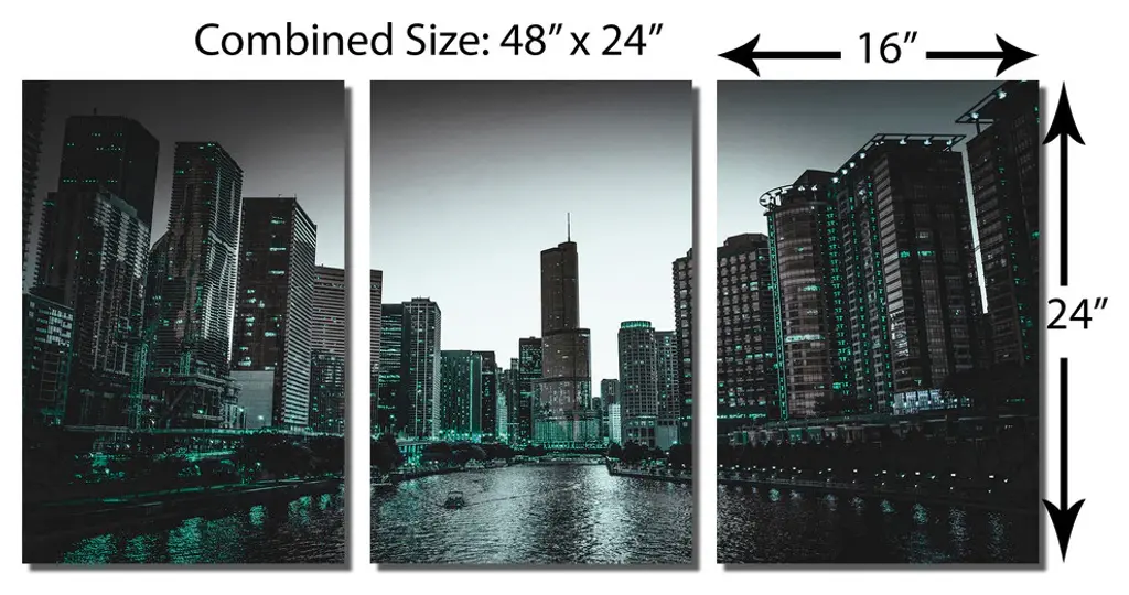 48" x 24" total size. Ready To Hang! (3 pieces - 16" x 24" each). 3 Panel Split (Triptych) Metal Print of Chicago, Illinois river skyline in Genoa color, blue green. Modern metal wall art for home or office wall decor & interior design. Printed on Luxurious, HD aluminum glossy metal panels. Multi panel art.. HD aluminum panels. Metal print wall art. Includes Shadow Wall Mount on the back.• Aluminum Metal Wall Art• Made in USA• Ready to hang - No assembly required• Shadow mount hardware on the back• 0.045" thick HD Aluminum Panels• Scratch resistant, glossy finish• Superb color clarity, luxurious prints• Epson printing process• For indoor or moisture rich environment use• Easy to clean. Gently wipe with microfiber cloth.