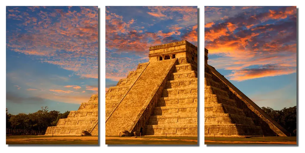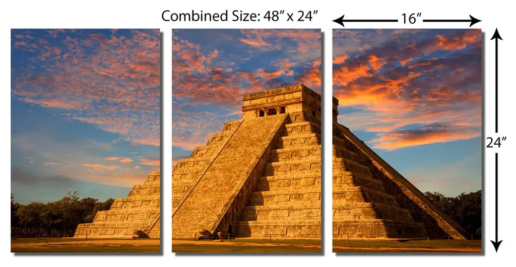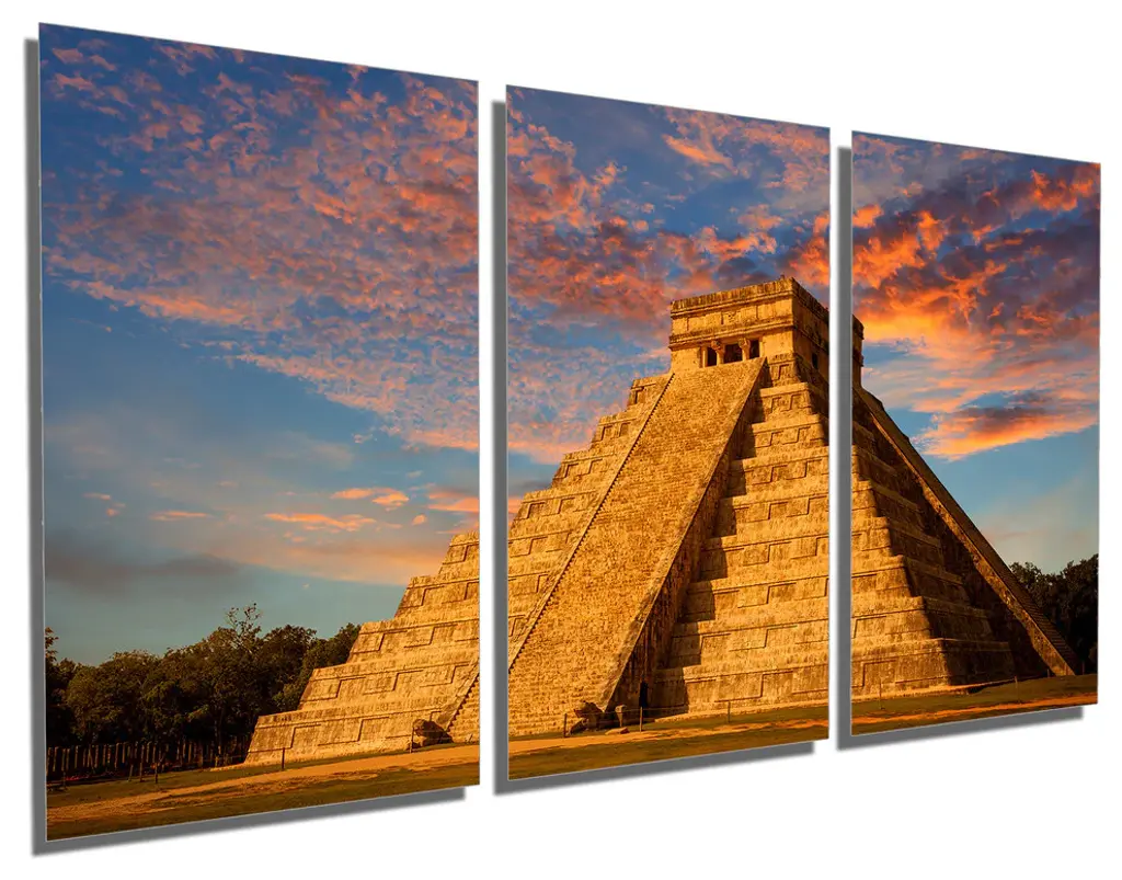 48"œ x 24"œ total size. Ready To Hang! (3 pieces - 16"œ x 24"œ each). 3 Panel Split (Triptych) Metal Print featuring world heritage landmark of the famous Kukulkan Temple, Chichen Itza in Yucatan, Mexico during sunset. Great for interior design & wall decor. Printed on Luxurious, HD aluminum glossy metal panels. Multi Panel. HD aluminum panels. Metal print wall art. Includes Shadow Wall Mount on the back.• Aluminum Metal Wall Art• Made in USA• Ready to hang - No assembly required• Shadow mount hardware on the back• 0.045"œ thick HD Aluminum Panels• Scratch resistant, glossy finish• Superb color clarity, luxurious prints• Epson printing process• For indoor or moisture rich environment use• Easy to clean. Gently wipe with microfiber cloth.