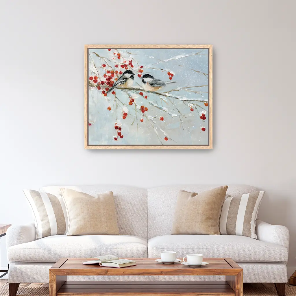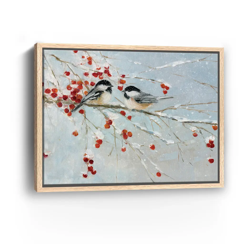 This canvas print evokes the gentle magic of winter mornings, with chickadees nestled among snow-dusted berries. Ideal for holiday decor or year-round tranquility, it adds warmth and grace to your space. Our Gallery Wrap Canvas Prints are proudly assembled with high quality materials in California, USA. Each piece is printed on a thick, archival grade canvas using Giclee technology. It is then hand-stretched by our experienced artisans over solid wood bars, which will not warp over time. The final product is a piece personally crafted for you to confidently display on your wall. Care and Assembly: Ensure that the location of your piece has little to no exposure to heat, sunlight, and moisture. Wipe clean, only if needed. Each piece includes hanging hardware to hang on your wall horizontally.
