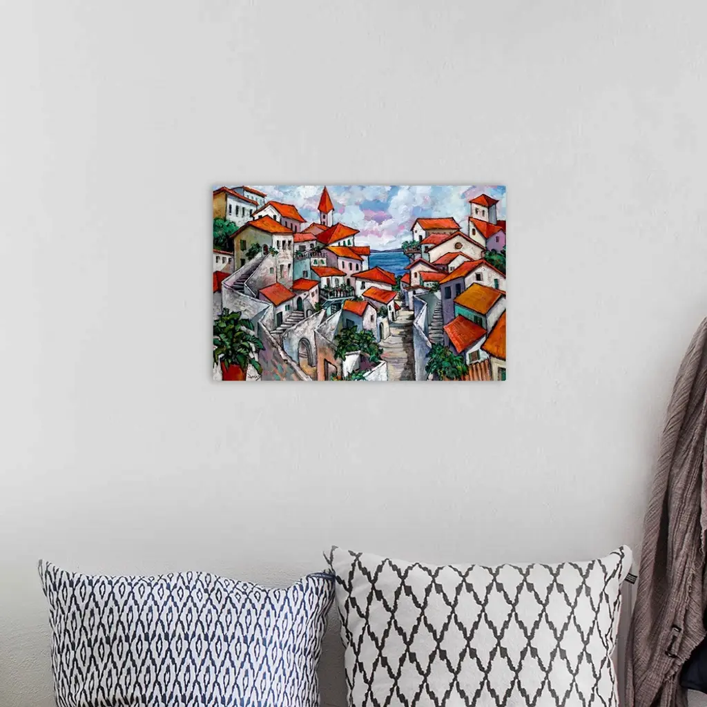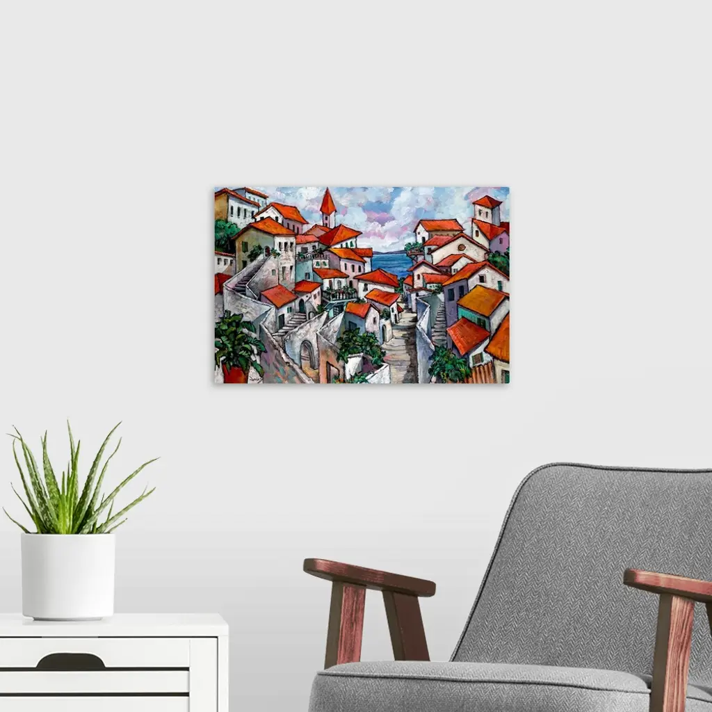 Large, horizontal, contemporary painting of an Italian village on a hill, constructed with stone walls and stairways, surrounded with greenery and plants, a sky full of fluffy clouds and a body of water in the background.