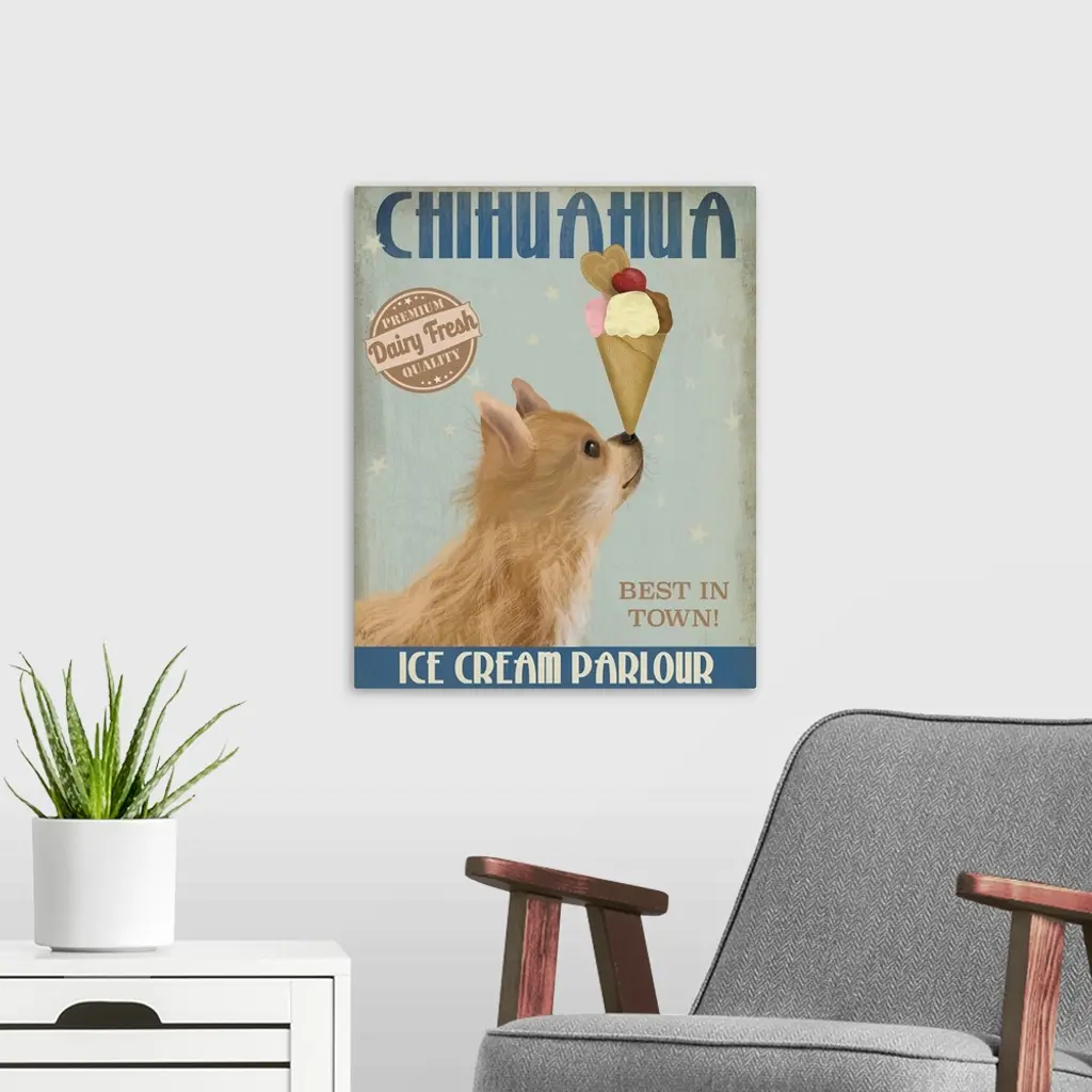 Decorative artwork of a Chihuahua balancing an ice cream cone on its nose in an advertisement for an ice cream parlour.