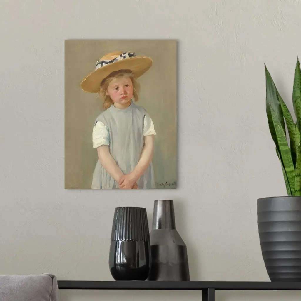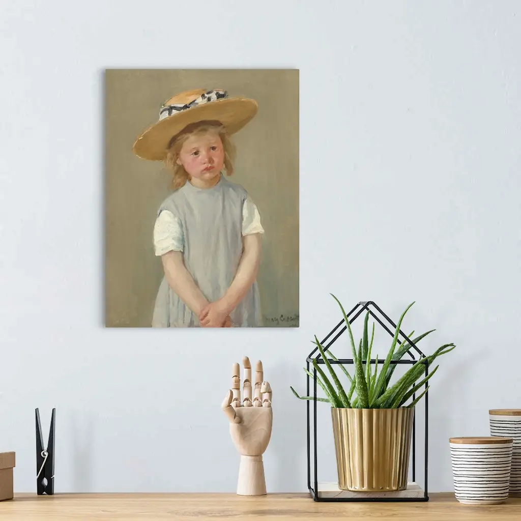 Child in a Straw Hat, by Mary Cassatt, 1886, American painting, oil on canvas. Cassatt captures the child's mixture of pensiveness, frustration, and boredom, as she stands for her portrait