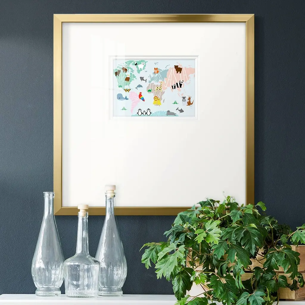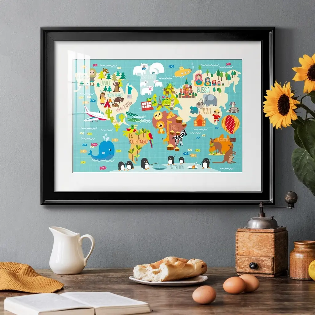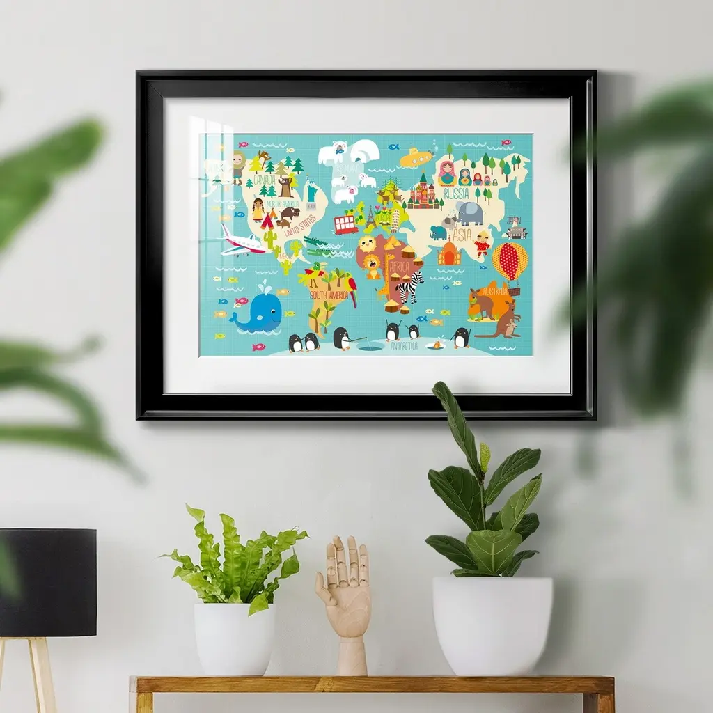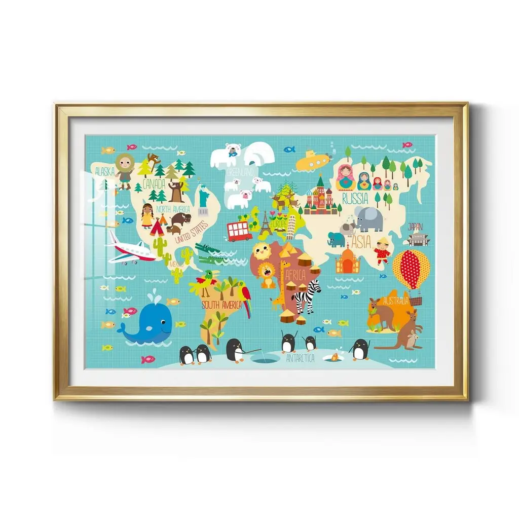 Children's World Map Premium Framed Print - Ready to Hang A Premium Framed Print created to last. Framed in distressed wood and available in an array of sizes and colors Featuring a beveled a solid wood stretcher bar, each piece comes ready to hand 4 SIZES AVAILABLE 30.5''X42.5'' - Overall Size 26.5'X36.5'' - Overall Size 22''x30'' - Overall Size 18''x24'' - Overall Size Each piece is made to order. Each piece comes with hanging hardware. Made in the USA Ready to Hang Giclee Paper Print Acrylic Glass Beveled Matt Board