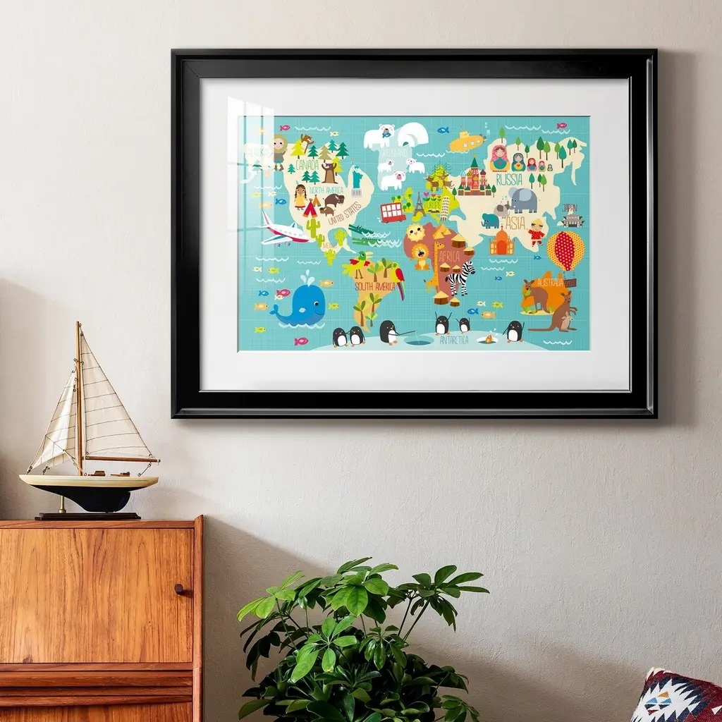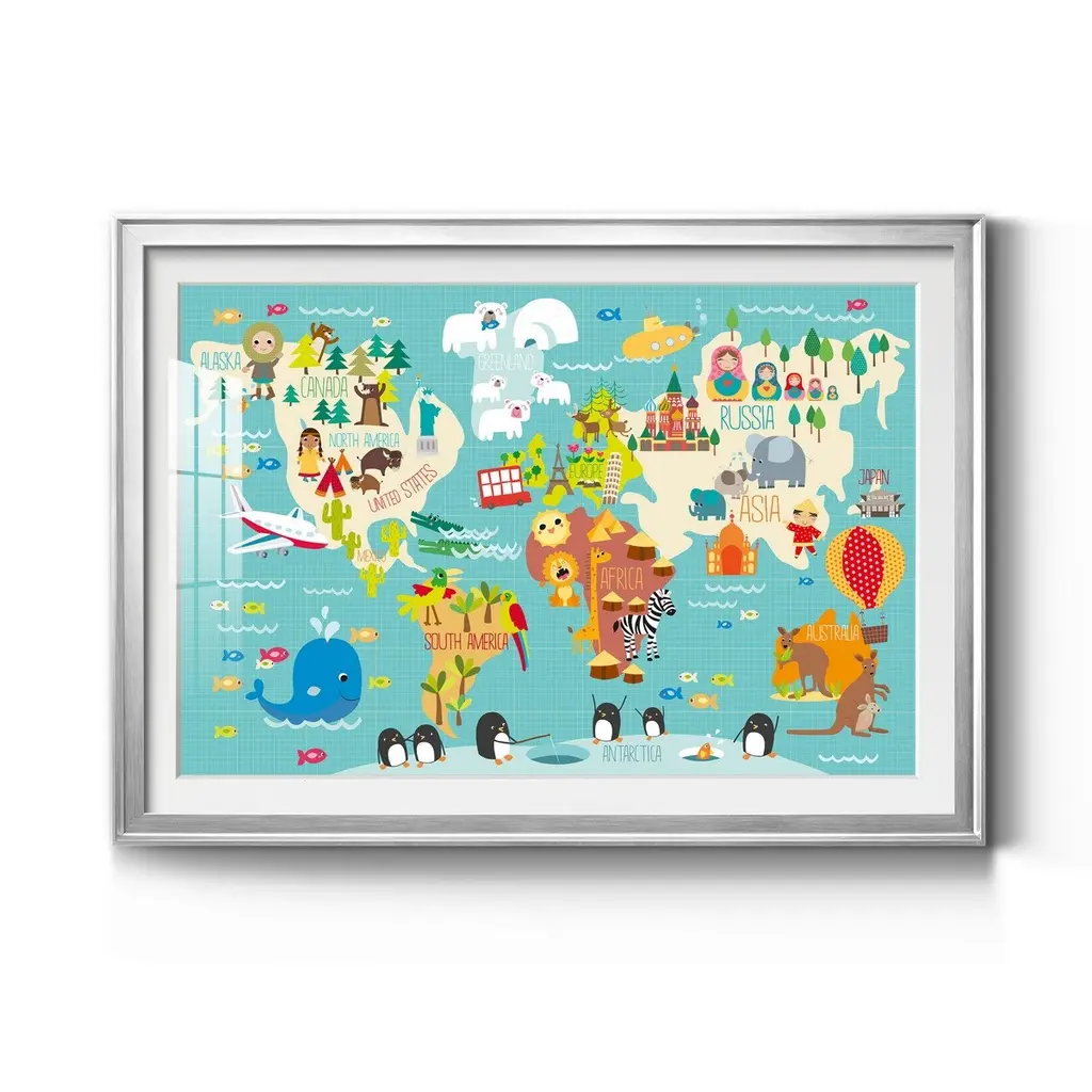 Children's World Map Premium Framed Print - Ready to Hang A Premium Framed Print created to last. Framed in distressed wood and available in an array of sizes and colors Featuring a beveled a solid wood stretcher bar, each piece comes ready to hand 4 SIZES AVAILABLE 30.5''X42.5'' - Overall Size 26.5'X36.5'' - Overall Size 22''x30'' - Overall Size 18''x24'' - Overall Size Each piece is made to order. Each piece comes with hanging hardware. Made in the USA Ready to Hang Giclee Paper Print Acrylic Glass Beveled Matt Board