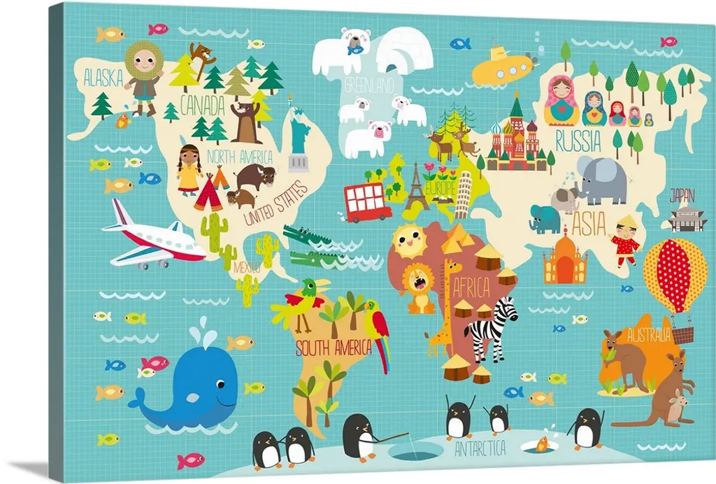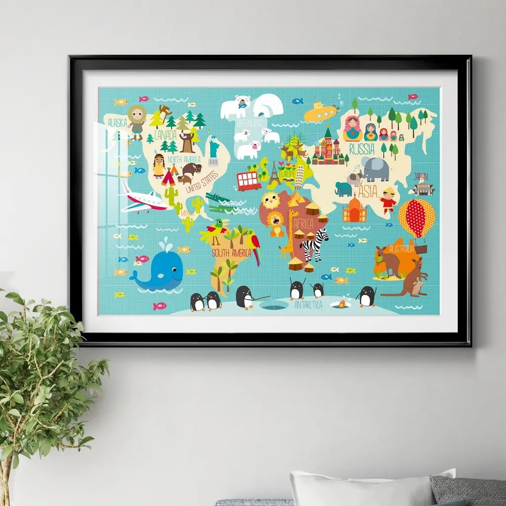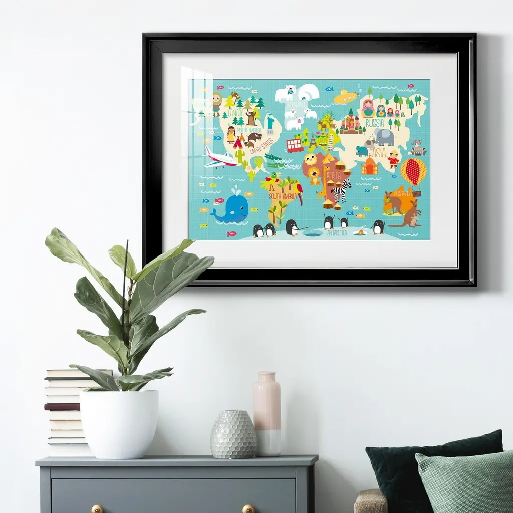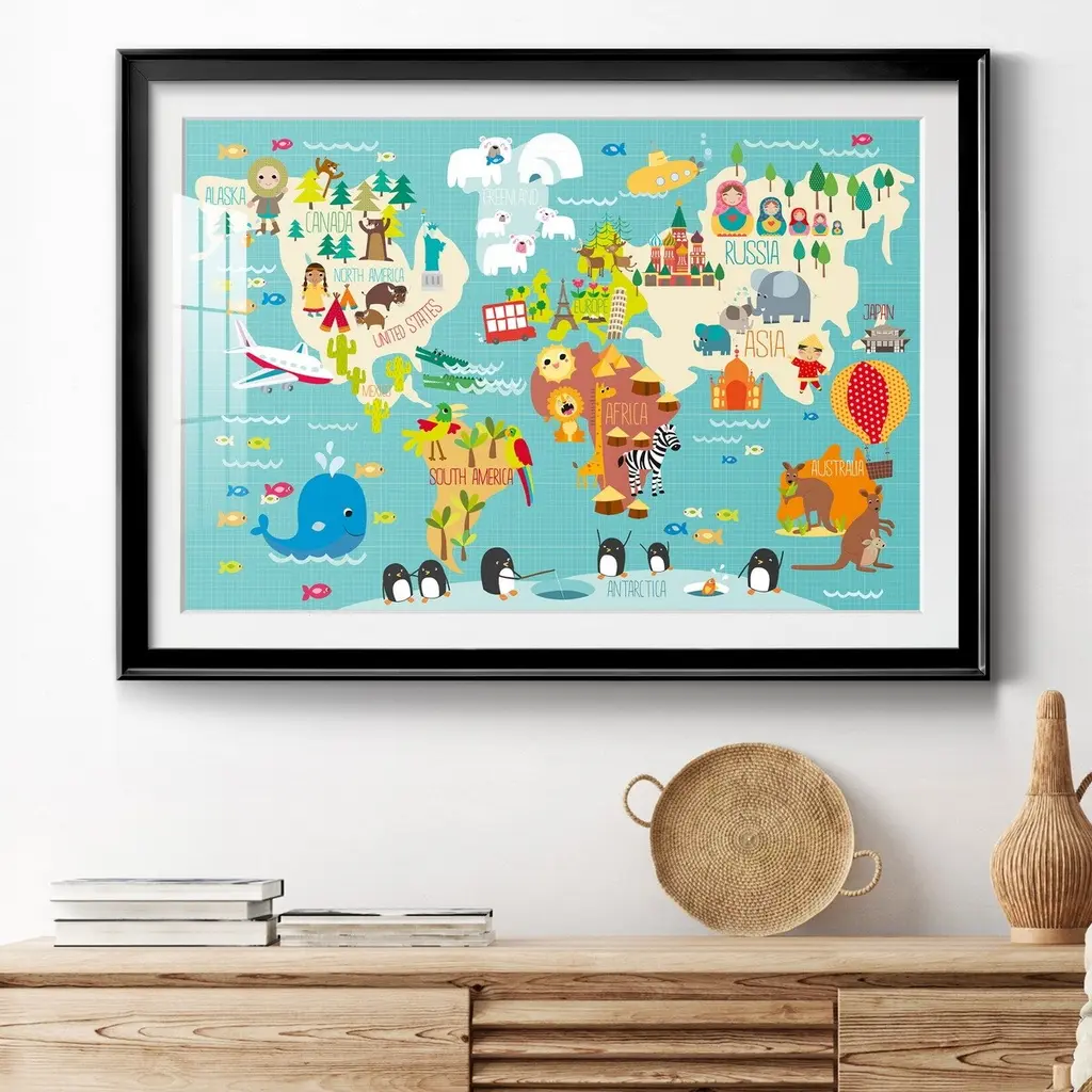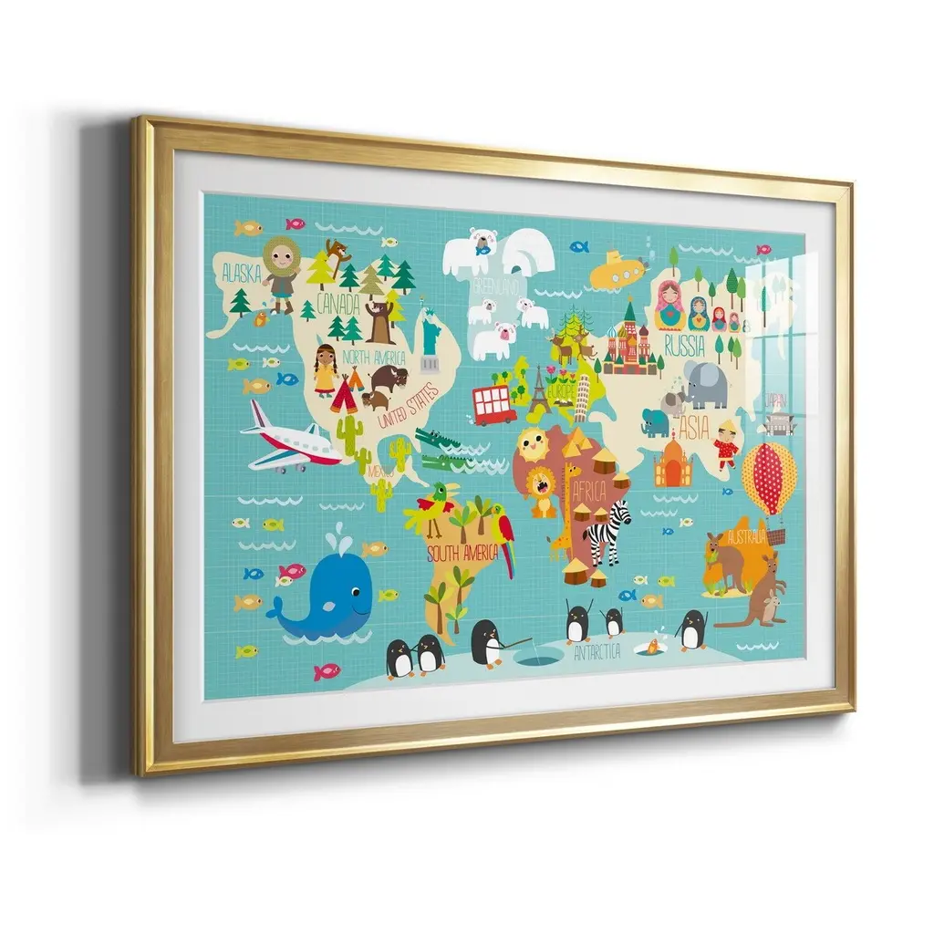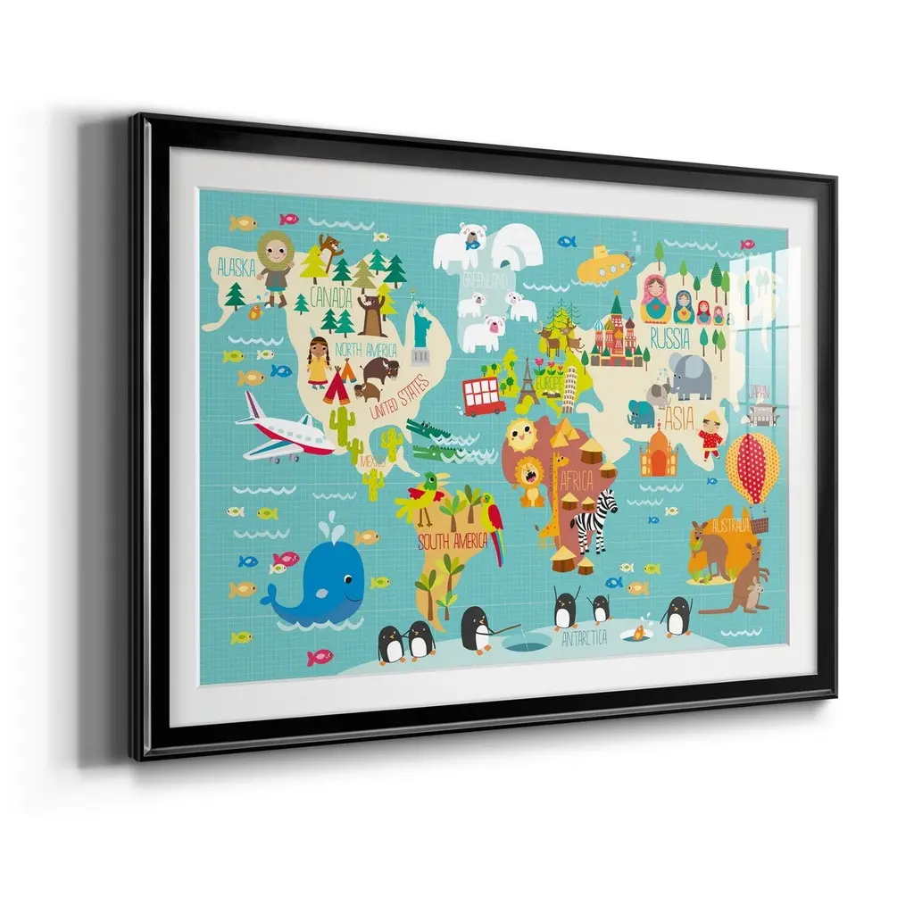 Children's World Map Premium Framed Print - Ready to Hang A Premium Framed Print created to last. Framed in distressed wood and available in an array of sizes and colors Featuring a beveled a solid wood stretcher bar, each piece comes ready to hand 4 SIZES AVAILABLE 30.5''X42.5'' - Overall Size 26.5'X36.5'' - Overall Size 22''x30'' - Overall Size 18''x24'' - Overall Size Each piece is made to order. Each piece comes with hanging hardware. Made in the USA Ready to Hang Giclee Paper Print Acrylic Glass Beveled Matt Board