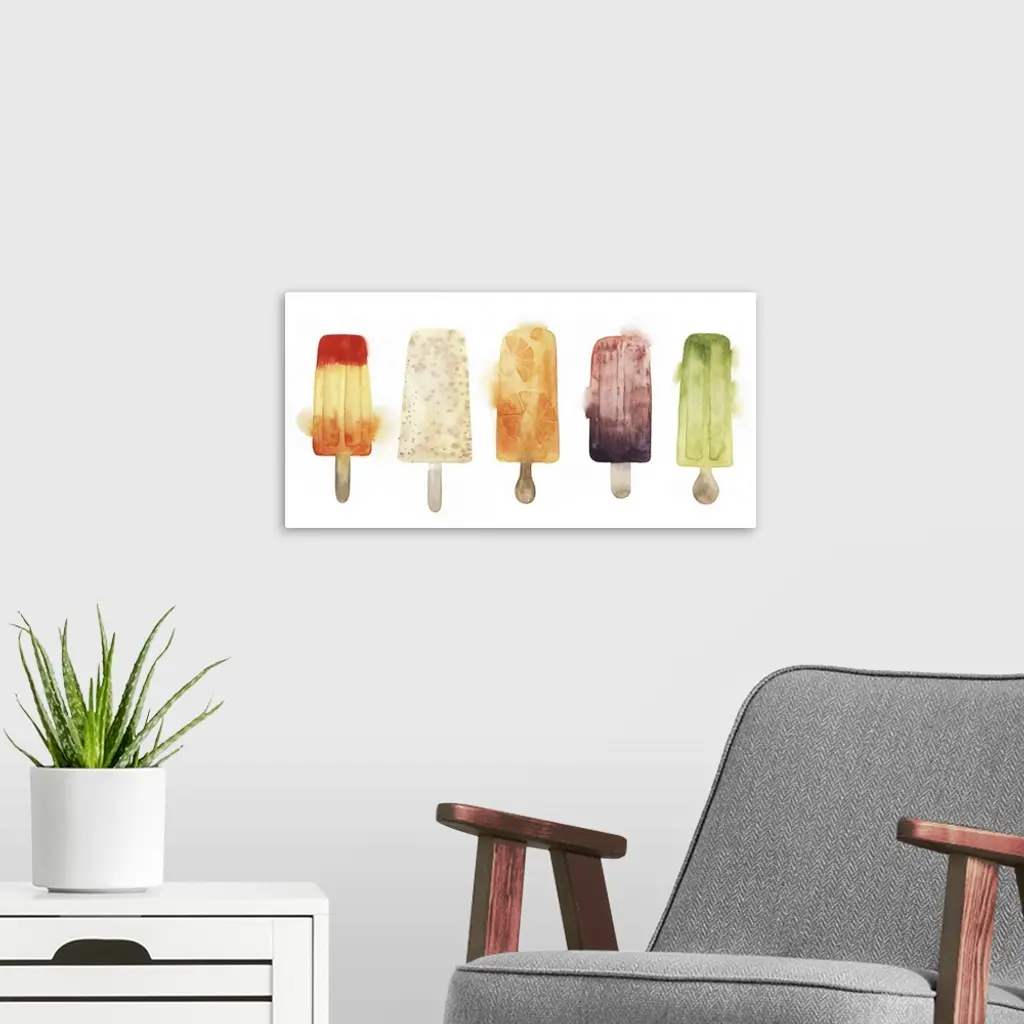 Contemporary watercolor painting of a row of colorful frozen treats.