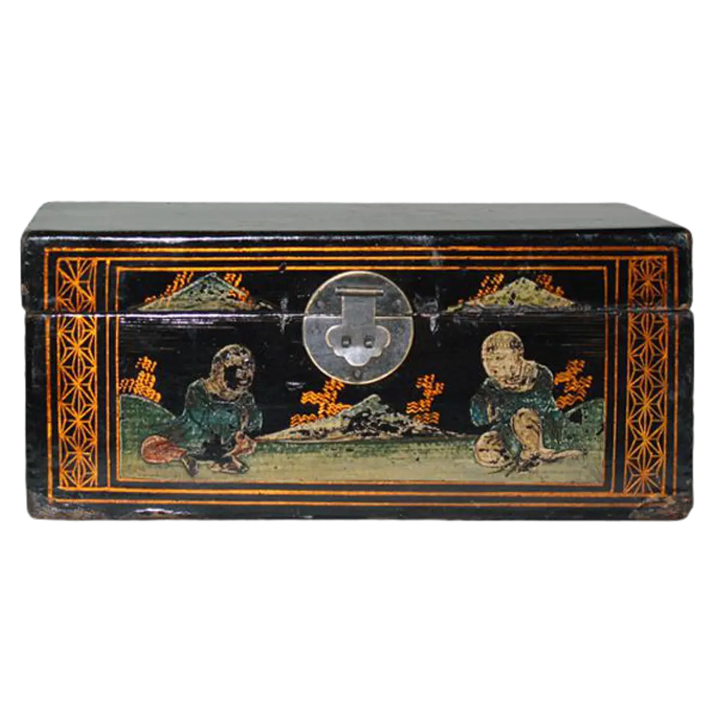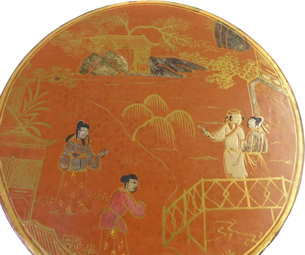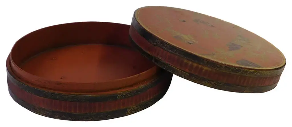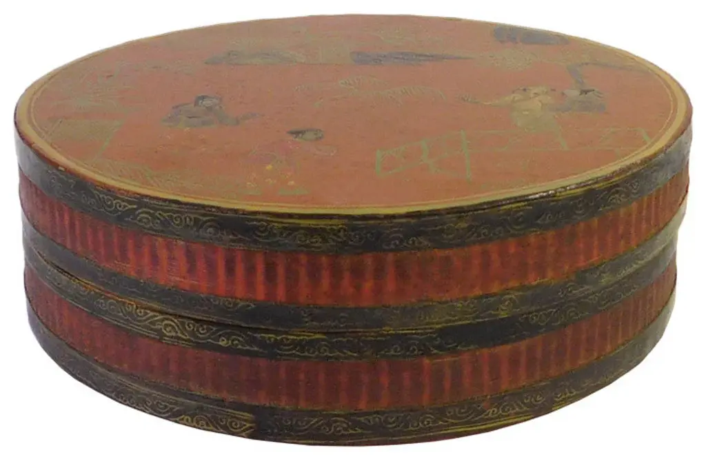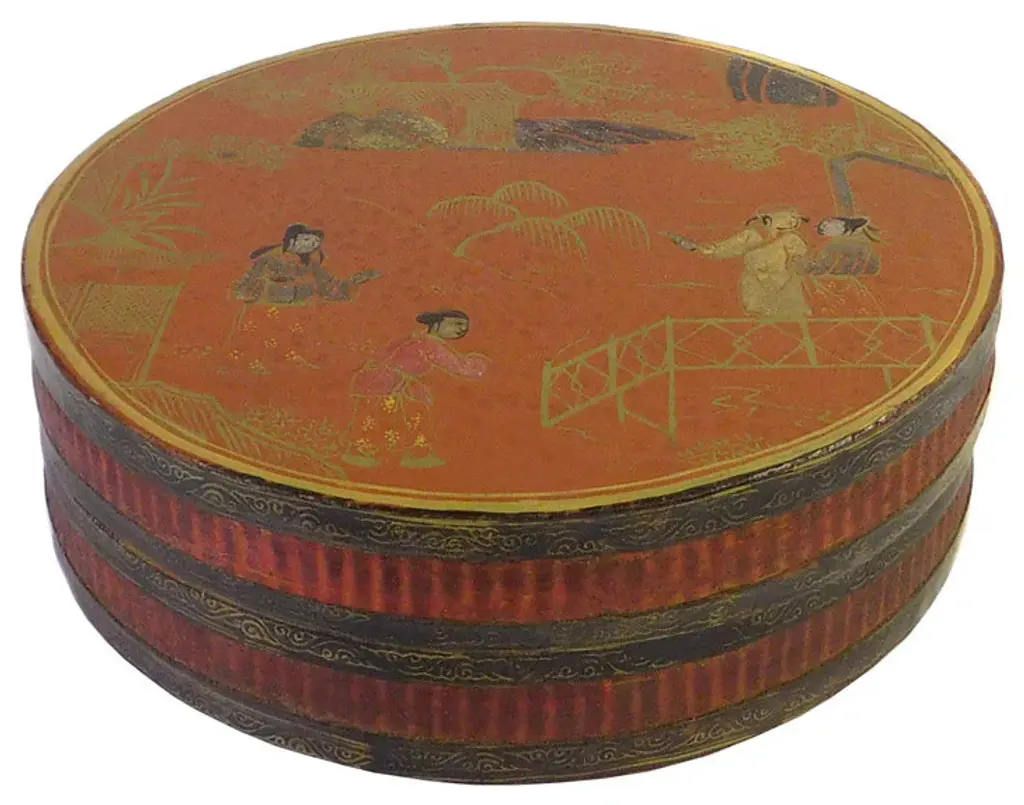 This decorative wooden flat round box is painted with light brown lacquer on the surface and oriental scenery is precisely drawn on the body.Dimensions: Dia 7.75" x h2.25"Origin: ChinaMaterial: WoodCondition: Hand Made, variation in the detail, not perfect