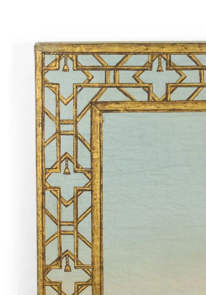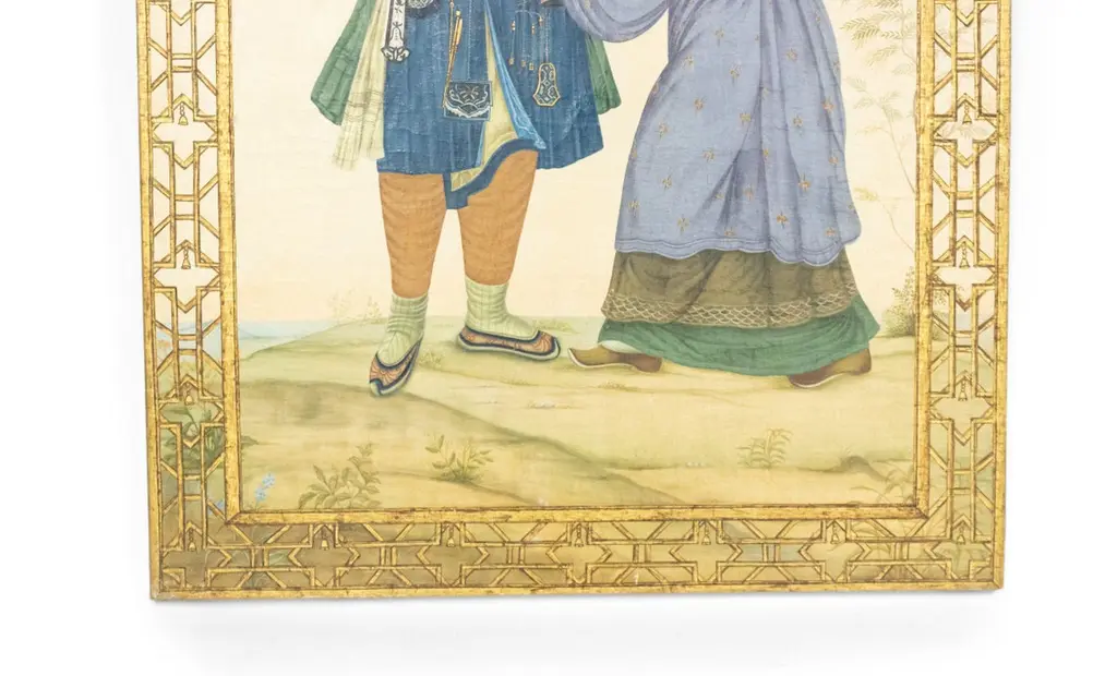 2 Asian Chinese style oil painting portraits on canvas of figural chinoiserie scene of man holding bird with bowing servant framed by gold leaf painted fretwork (Similar to 058969) (PRICED EACH)