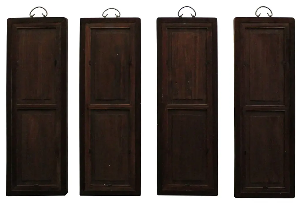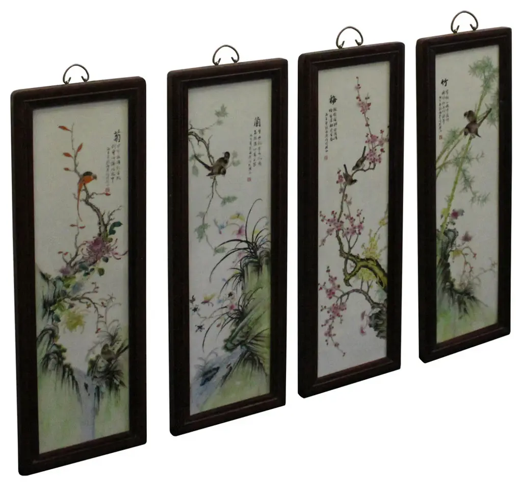 This is a set of four wooden wall decor panels with a brown stain finish. It has a colorful handpainted flower and bird graphic on the center porcelain plaque. Dimensions: w11" x h32" x thickness 1" each ( 4 pieces )Origin: ChinaMaterial: Wood, porcelainCondition: Vintage style finish, wear out marksEra : recent made