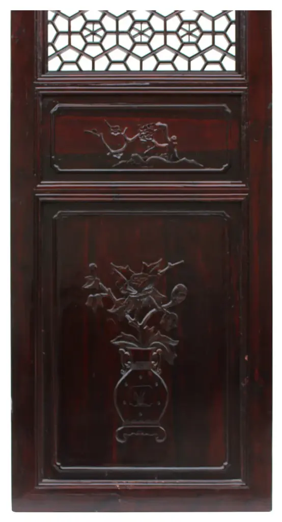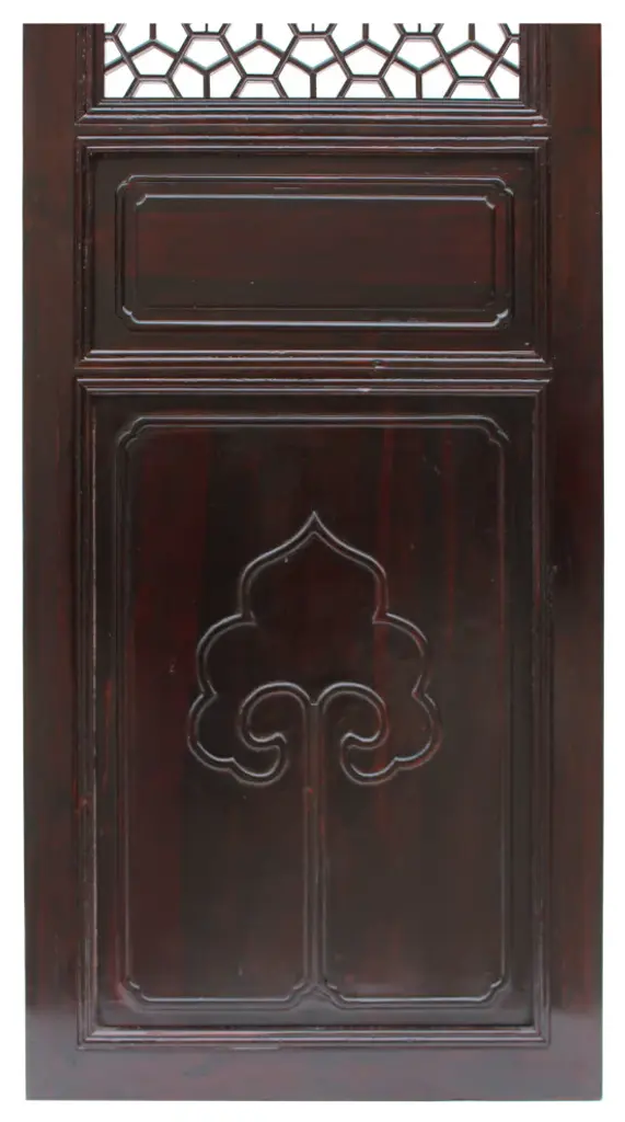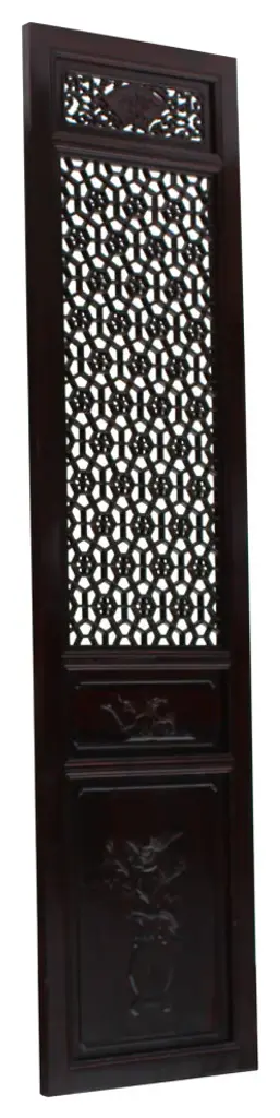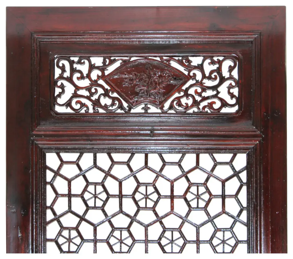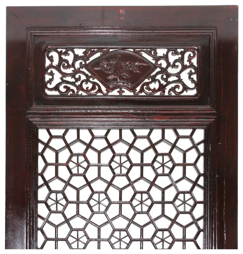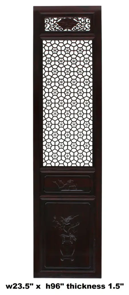 This is a Chinese wood panel with a geometric lattice pattern at the center. The top has a see-through motif and the bottom has a solid part with a motif. It has natural wood patina and dark brown stain tone. Two sides finish.Dimensions: w23.5" x h96" x thickness 1.5"Origin: ChinaMaterial: WoodCondition: Handmade natural wood marks and imperfection, wood pattern variation