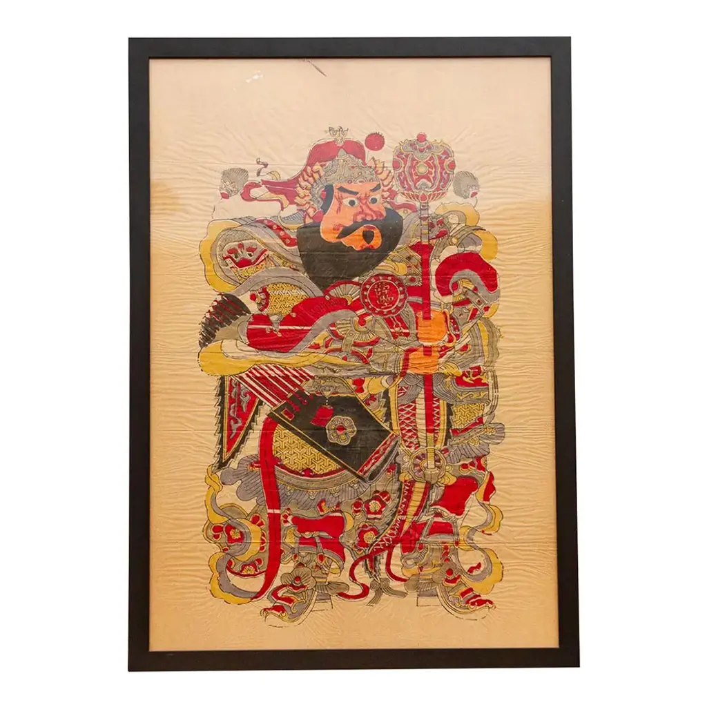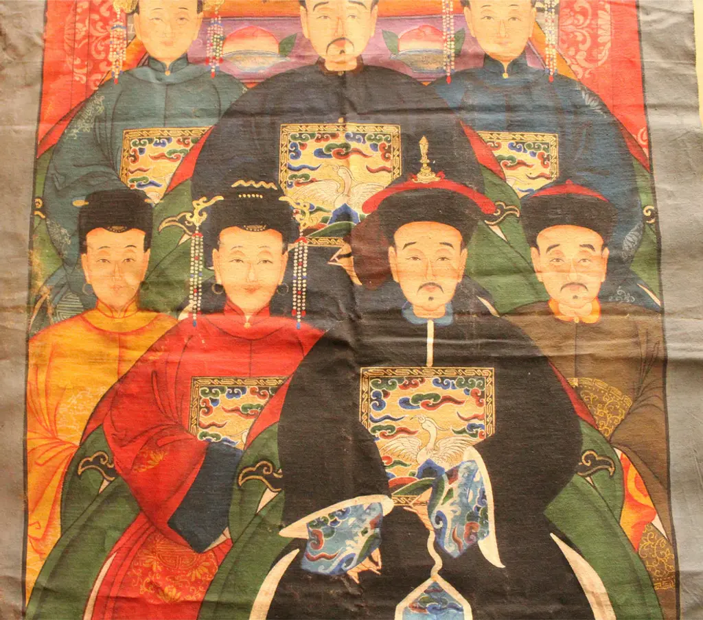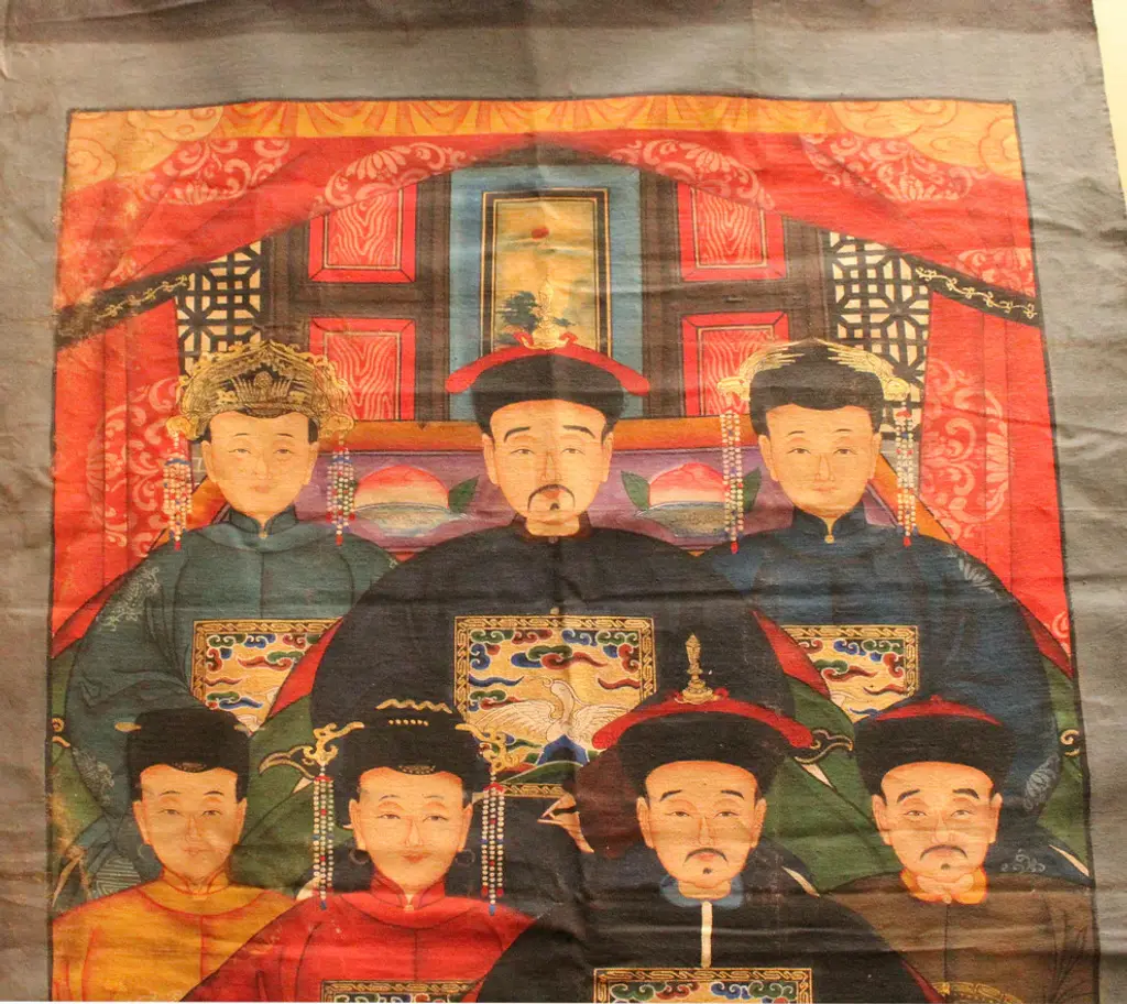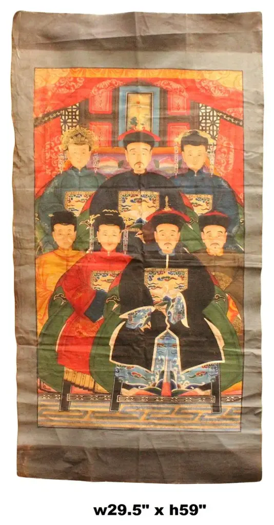 This is a handpainted Chinese accent decorative canvas art with Ancient Chinese ancestors portrait theme. Outline, dressing, details, coloring and the face are finished by a person specialized. Dimensions: w29.5"x h59" approx uneven edgeOrigin: China Material: Canvas Fabric Condition: Fold marks, minor color off, not even edge, water marks around the edgeWork: Ship in rollEra : recent made