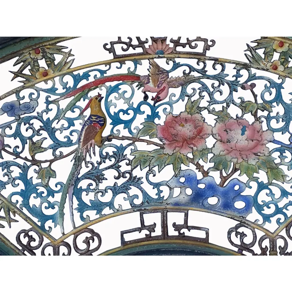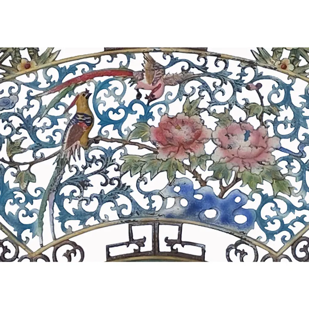 This is a wooden wall decor with a Chinese traditional flower bird theme surrounded by a simple geometric pattern. It has been painted in distressed matte black trim and chalks colorful details.Dimensions: w40" x h21.5" x thickness 1"Origin: ChinaMaterial: WoodCondition: Vintage distressed finish, natural wood imperfection, and marksUSA domestic continental buyers of 48 states pay $69 for shipping (buyers of Hawaii, Alaska, US Islands, Florida Keywest, and Canada pays the extra shipping cost). Insurance and handling charges are already included in the shipping cost. In-store pick-up is highly welcomed if you are in San Francisco Bay Area. (No charge)