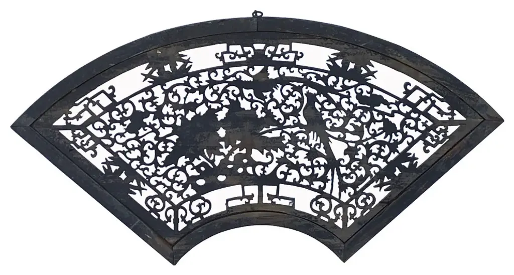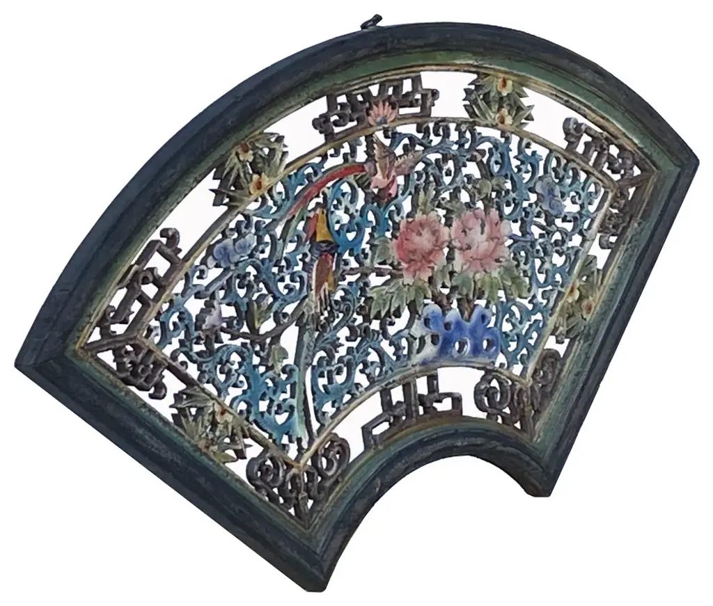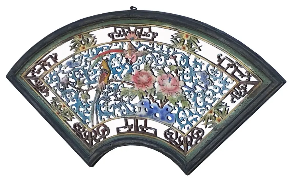 Chinese Matte Chalk Color Fan Shape Flower Bird Wood Wall Panel, Hws2176