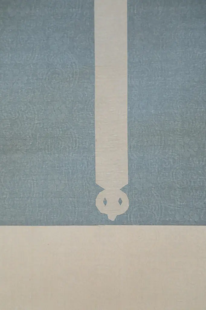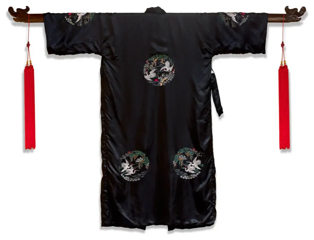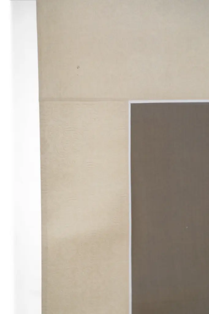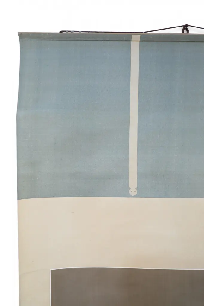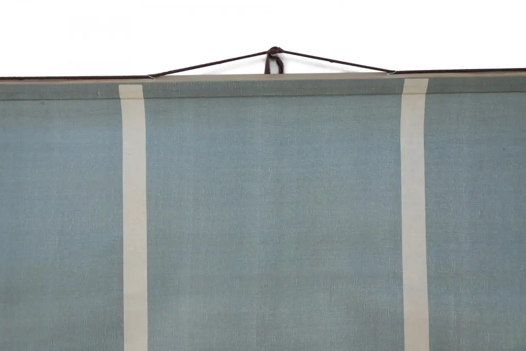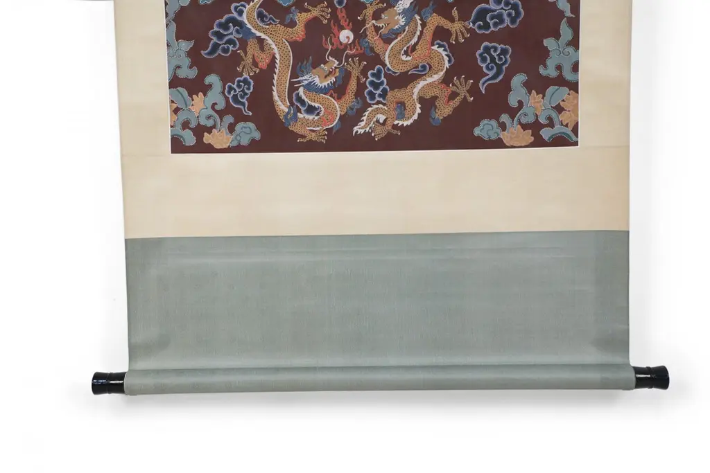 Set of 3 Ming King and Queen scroll wall hangings, shown seated with a paneled wall behind them and a brown rug with dragons underneath against a pale gold silk shantung background with tonal flowers and scroll designs with a sage green top and bottom. (PRICED EACH).