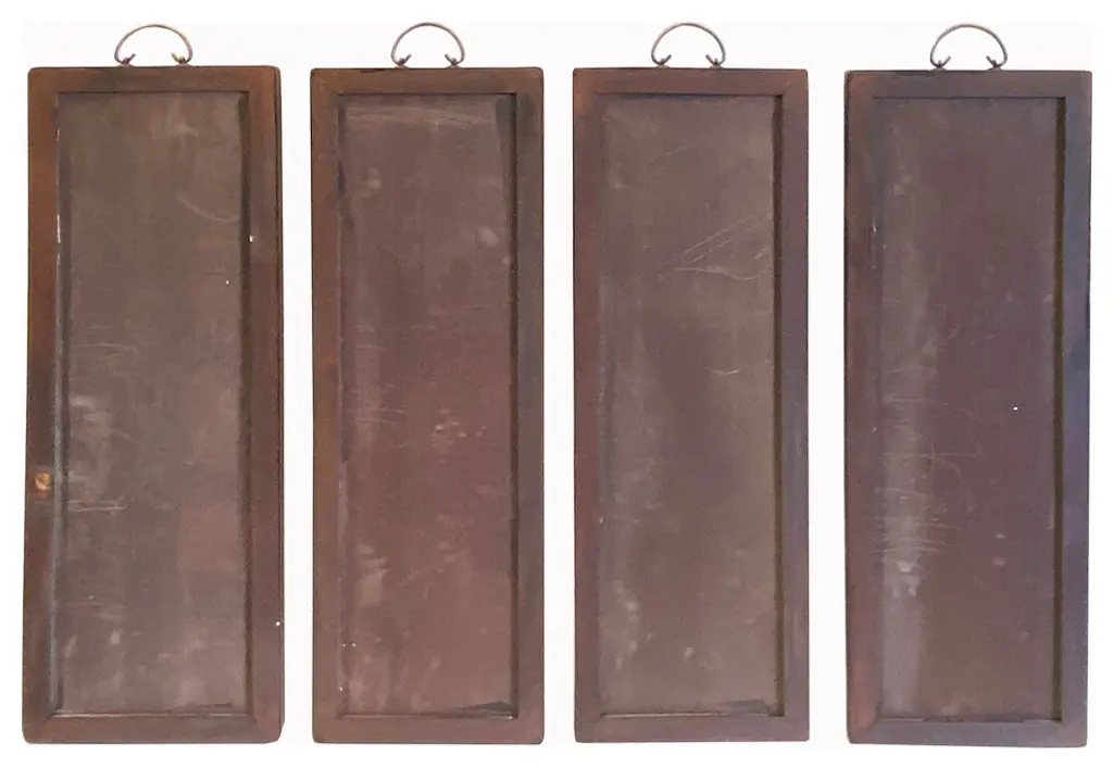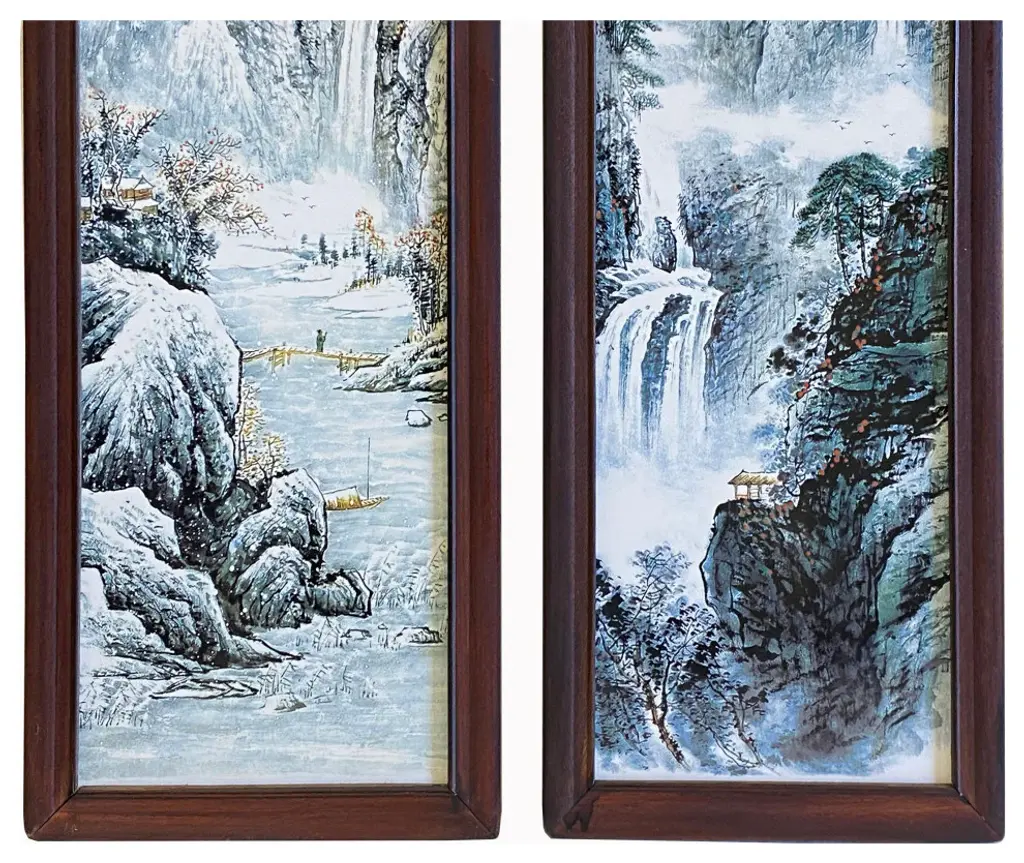 This is a four pieces porcelain print painting wall decorative panels set. The distressed off-white part is made of porcelain and the frame is made of wood. Every single panel has graphics about mountains, rivers, and villages. This is a gorgeous set for your wall decoration.Dimensions: w10.75" x h 31.25" x 1" thickness / eachOrigin: ChinaMaterial: Porcelain and WoodCondition: handmade, vintage style finish production, minor wood cracks on the frame(buyers of Hawaii, Alaska, US Islands, Florida Keywest, and Canada pays the extra shipping cost). Insurance and handling charges are already included in the shipping cost.