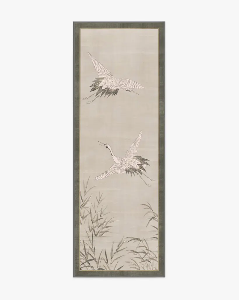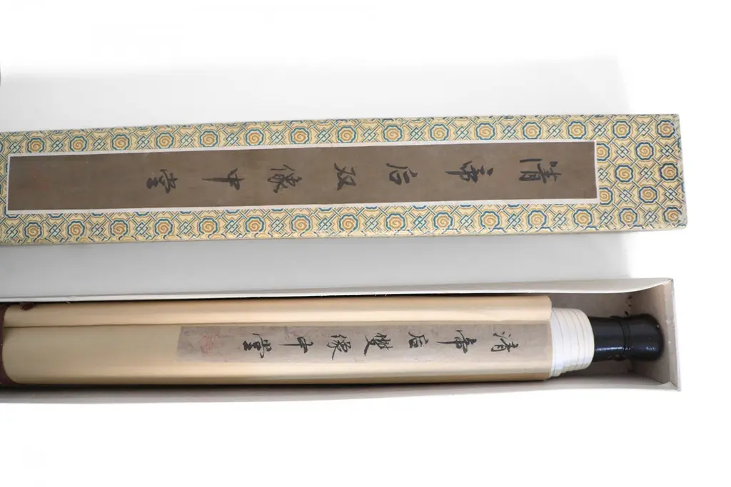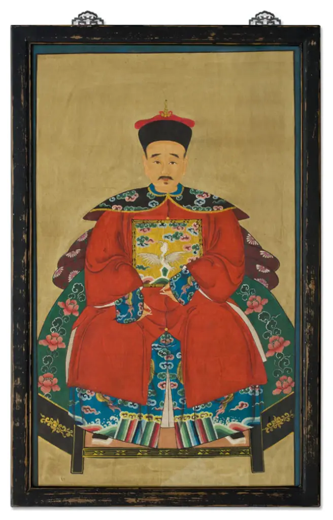 3 Chinese Qing Dynasty-style scroll wall hangings depicting a king seated on a chair draped in ornate cloth, a mushroom colored background and floral rug beneath him. The rest of the scroll is a pale gold silk shantung with floral scroll design. (PRICED EACH)