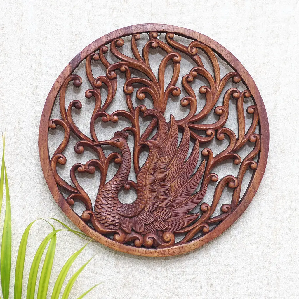 Chinese Round Wood Flower Birds Wall Plaque Hanging Panel