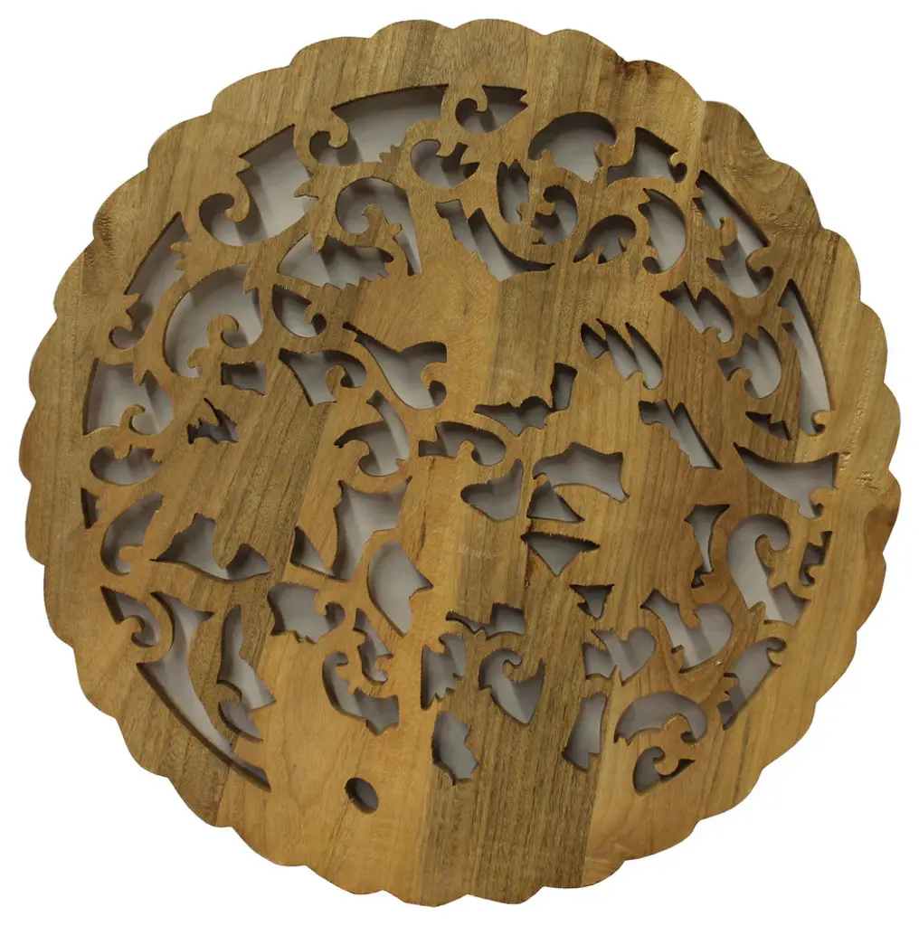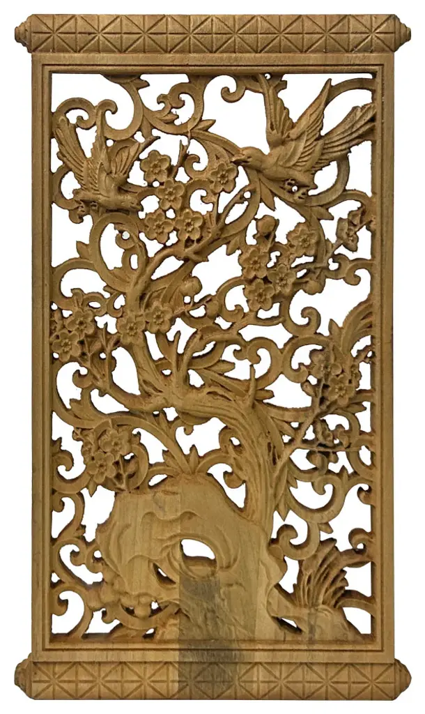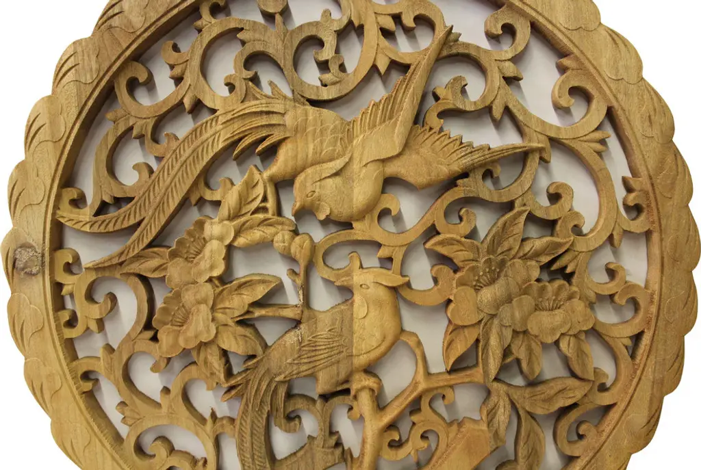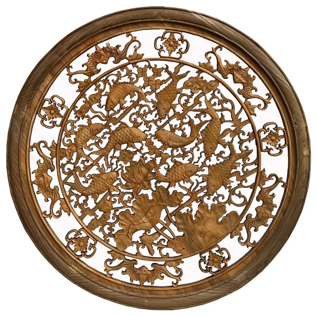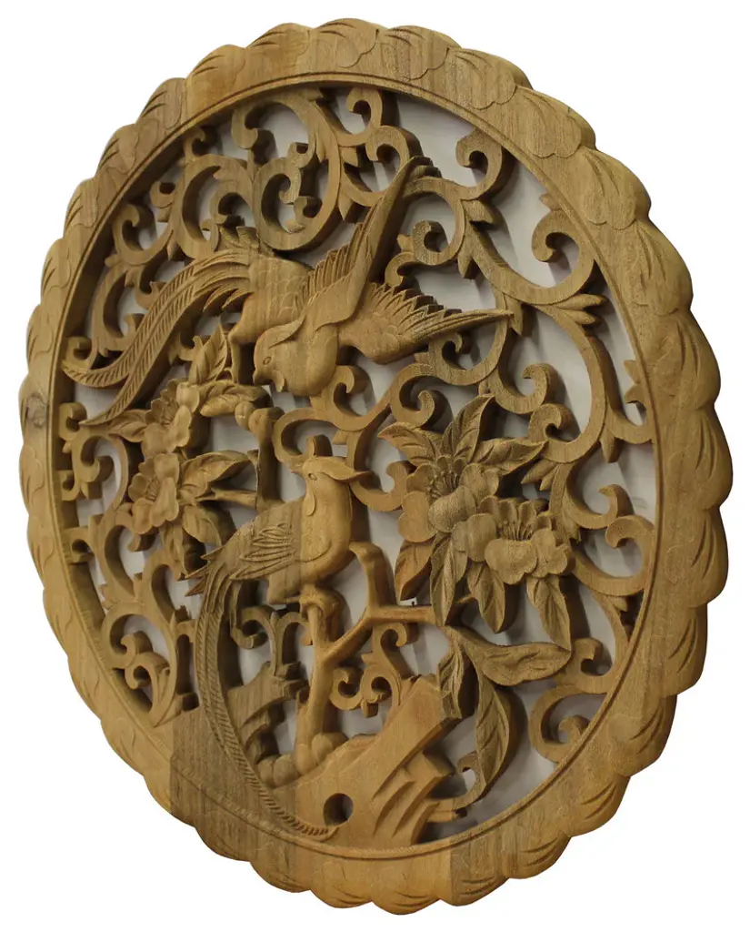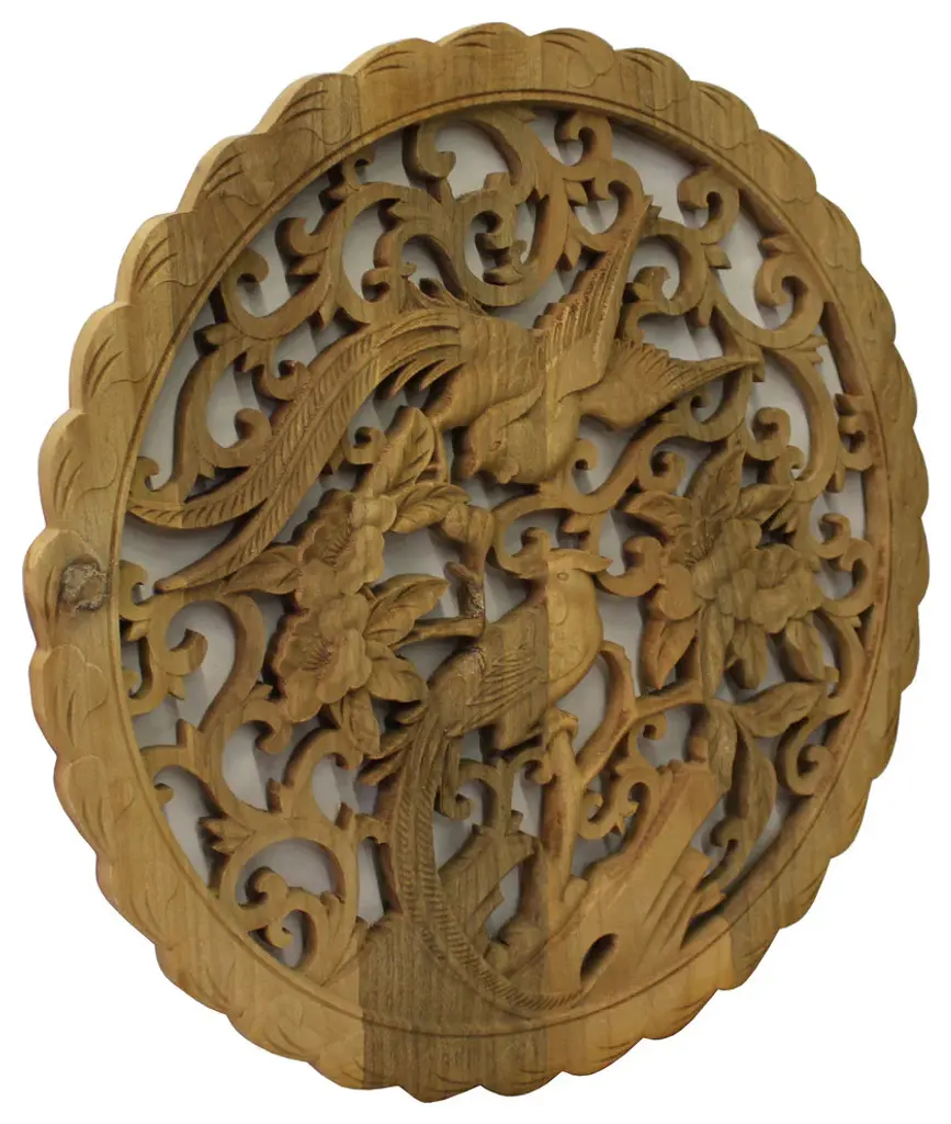 This is a round shape wooden wall decor with Chinese Flower and birds theme surrounded by a simple geometric pattern. Dimensions: Dia 19.5" thickness 1.5"Origin: China Material: Wood Condition: Natural wood imperfection and marks Era : Recent
