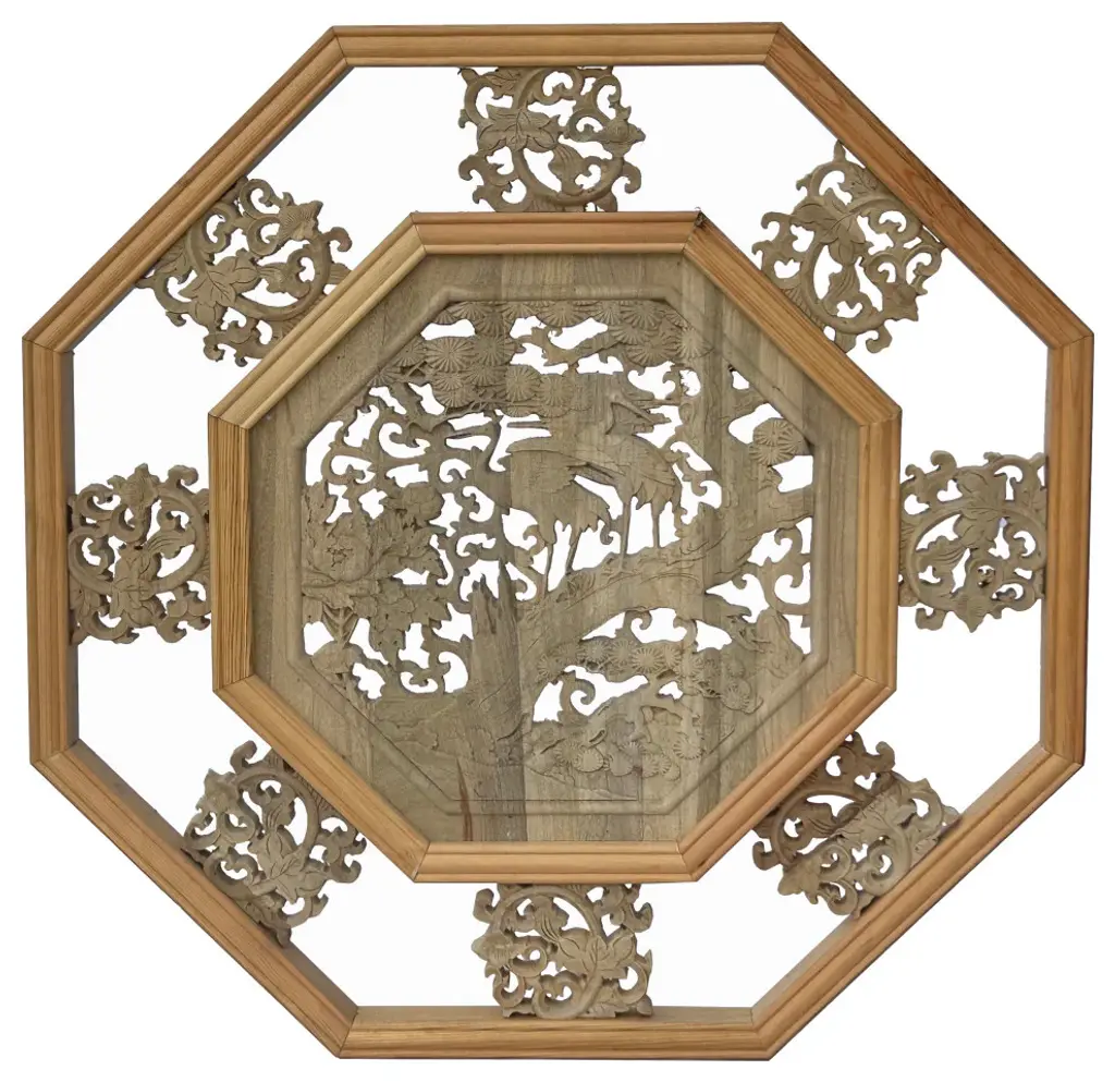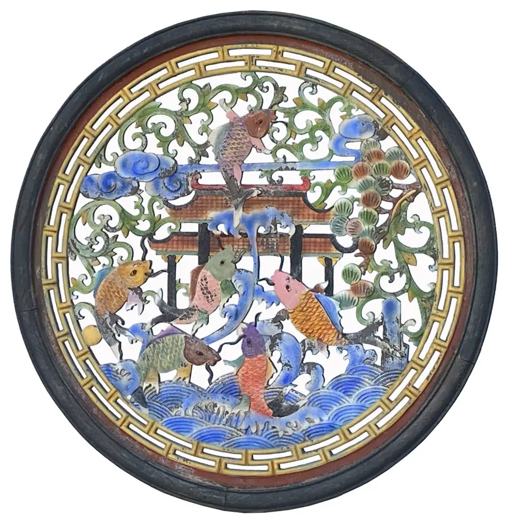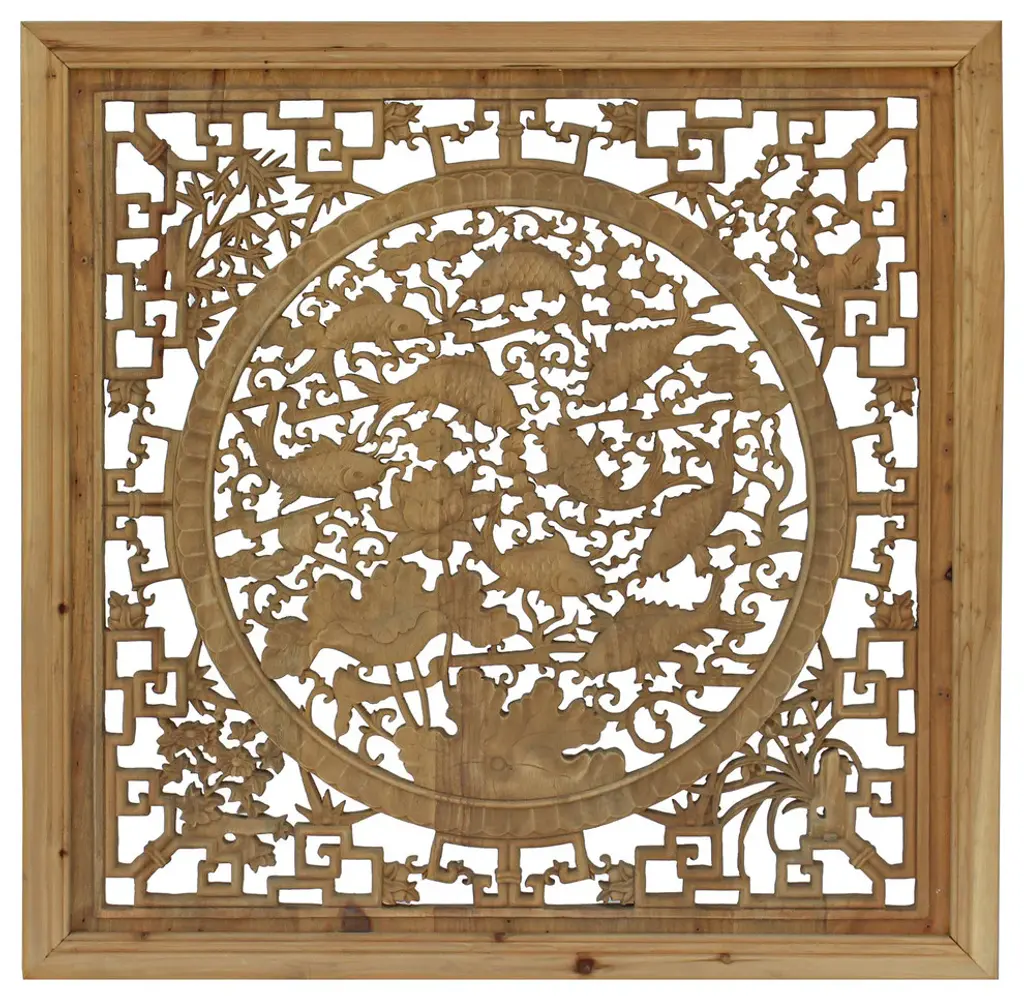 This is a square wooden wall decor with Chinese flower and fishes theme surrounded by a simple geometric pattern. ( variation in wood pattern )Dimensions: 31.5" x 31.5" x thickness 1.25"Origin: China Material: Wood Condition: Natural wood imperfection and marksWork: ship in one piece, one side finish, flat surface at the backEra : recent made 2017 new